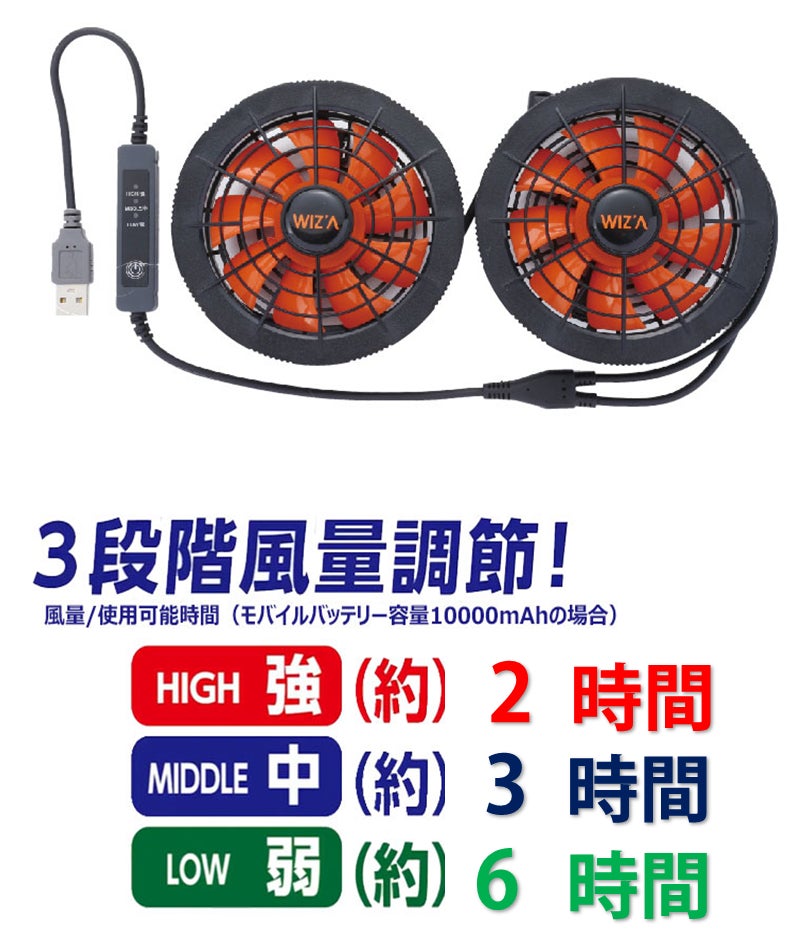 ※ 超大風量モデル:出力が12V/1.5A以上のモバイルバッテリーがご使用いただけます。