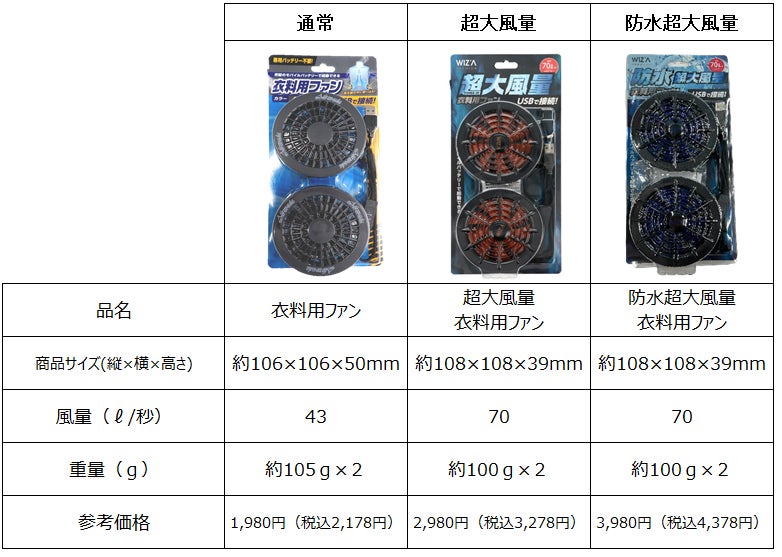「通常モデル」、「超大風量衣料用ファン」、防水機能が付いた「防水超大風量衣料用ファン」の3種類を販売します。