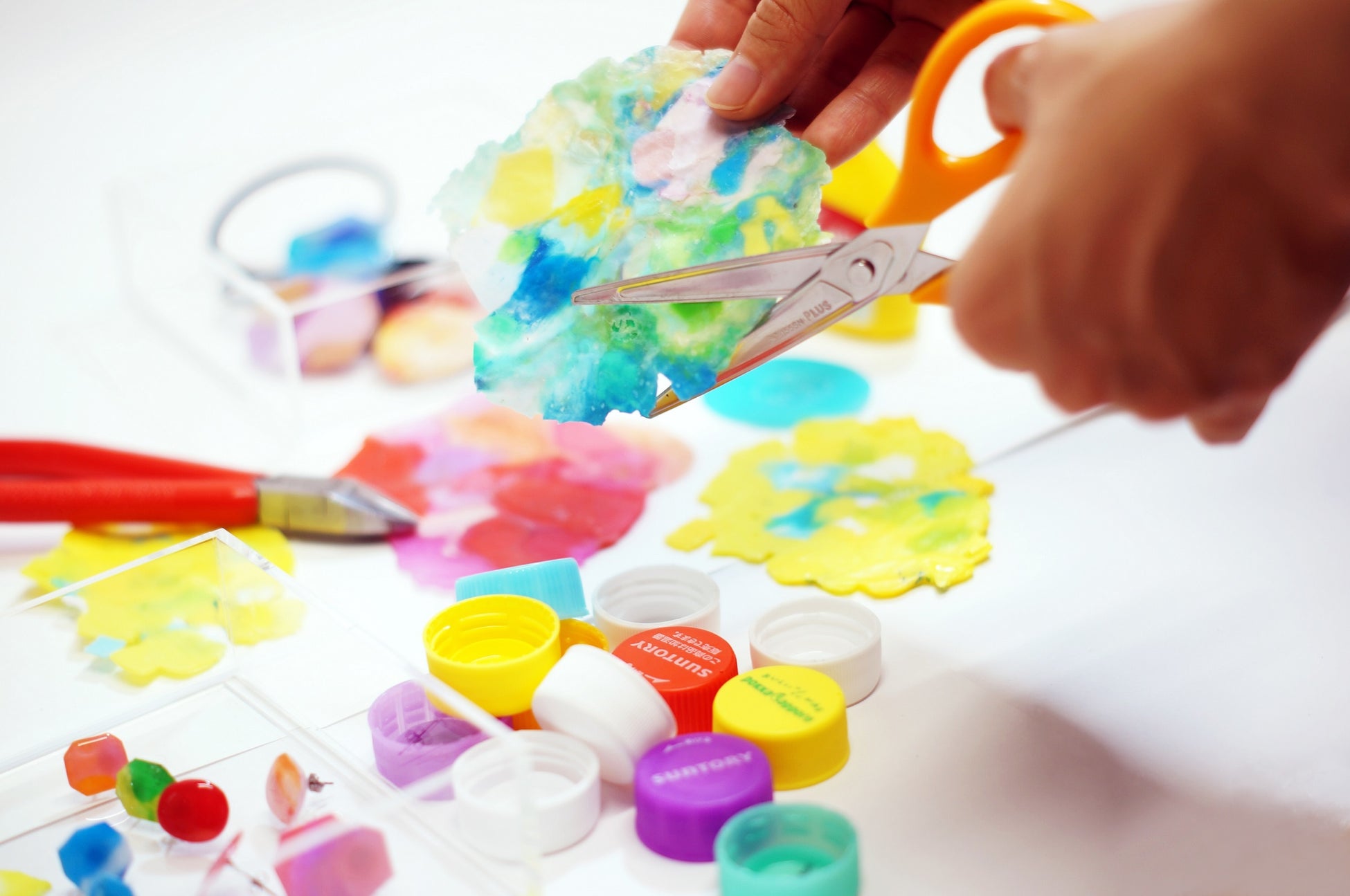 原材料は、JR新宿駅で回収されたペットボトルキャップ。それらを洗浄・加工をして、ピアスやイヤリング、ヘアゴムにしていきます。パーツの色味や厚さが異なるのはもちろん、時にはキャップに印字されている文字がそのまま柄として浮き出たりと、アップサイクルならではのおもしろさを感じることができます。