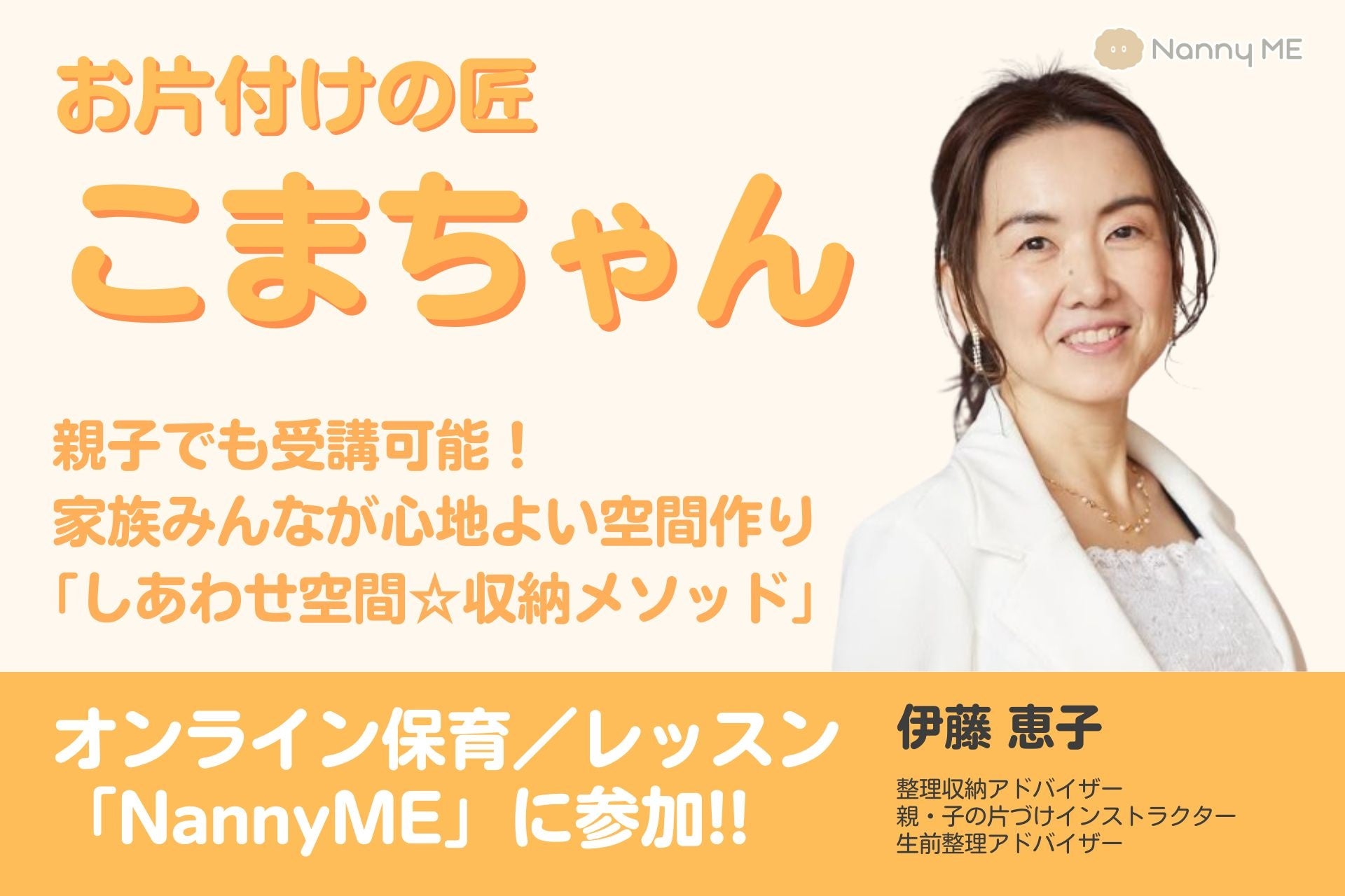 オンライン保育/レッスン「NannyME」(運営:株式会社七色、代表取締役CEO:佐々木綾香)は、整理収納アドバイザーの伊藤恵子氏(通称こまちゃん)をお片付けのNanny(講師)として迎えました。