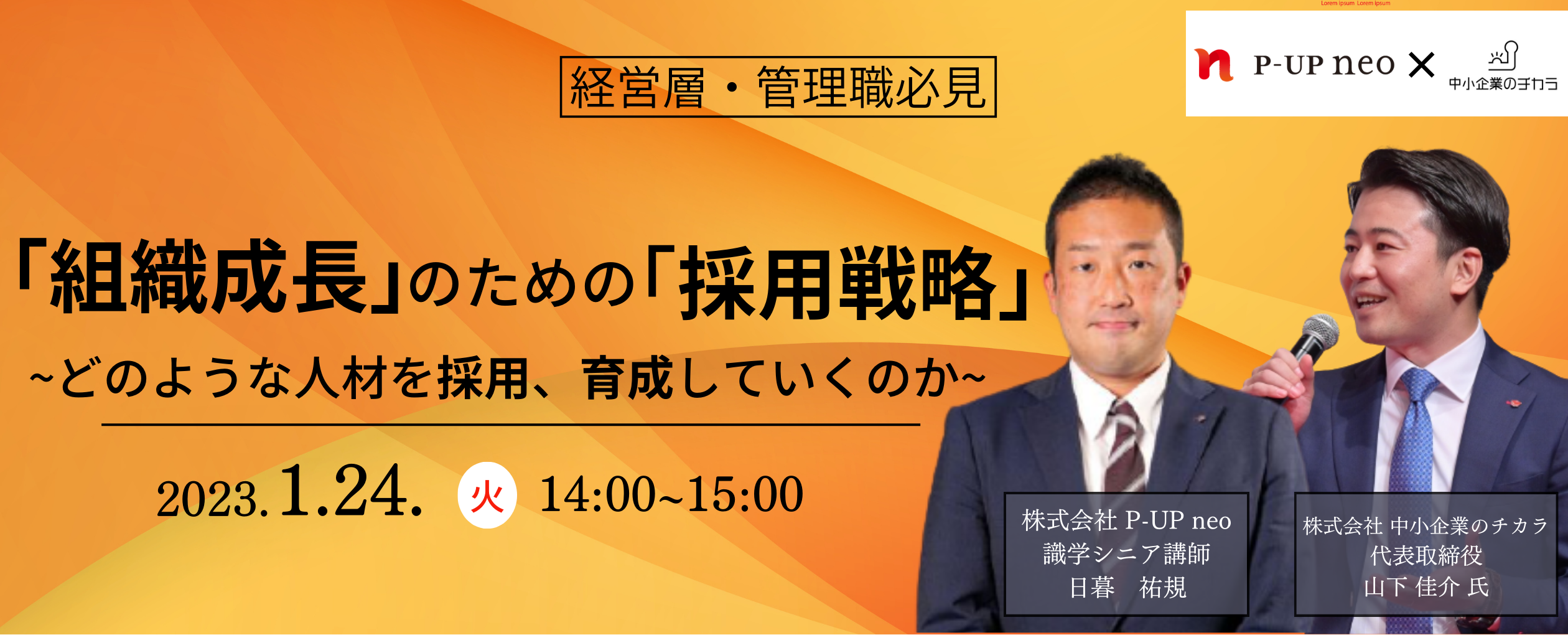 中小企業支援(ブランディング、WEB マーケティング、SDGs支援)事業を行う株式会社中小企業のチカラ(本社:東京都渋谷区、代表取締役社長:山下 佳介、以下「中小企業のチカラ」)(https://smes-chikara.co.jp/)は、株式会社P-UP neoの識学シニア講師 日暮様をお招きし「組織成長」のための「採用戦略」について、2023年1月24日(火)オンラインにて開催いたします。
