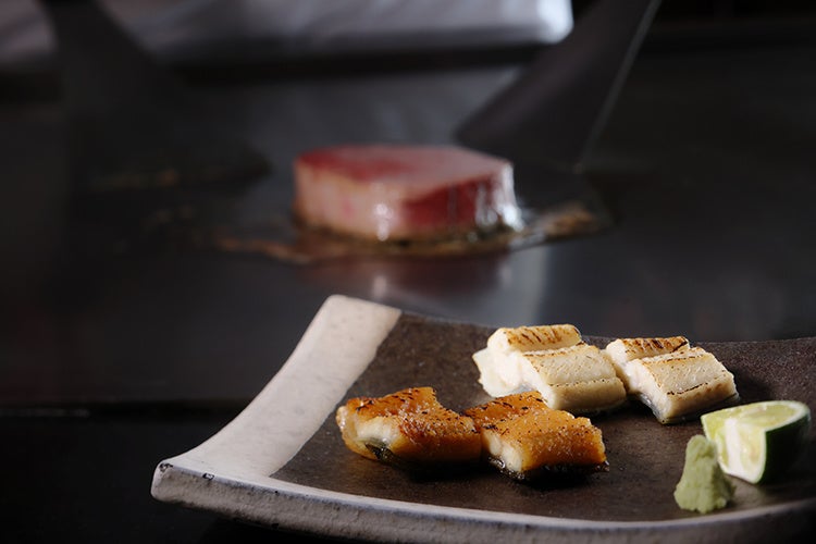 カウンター席でシェフとの会話も楽しい鉄板焼コース。鉄板焼で仕上げる出し巻き卵に、食欲そそる香りが特徴の「鰻白焼きとタレ焼」は山葵・酢橘(すだち)・ 塩でさっぱりと。メインは柔らかさが魅力の「国産牛フィレ肉」をご用意。目の前で焼き上げるライブ感をぜひお楽しみください。