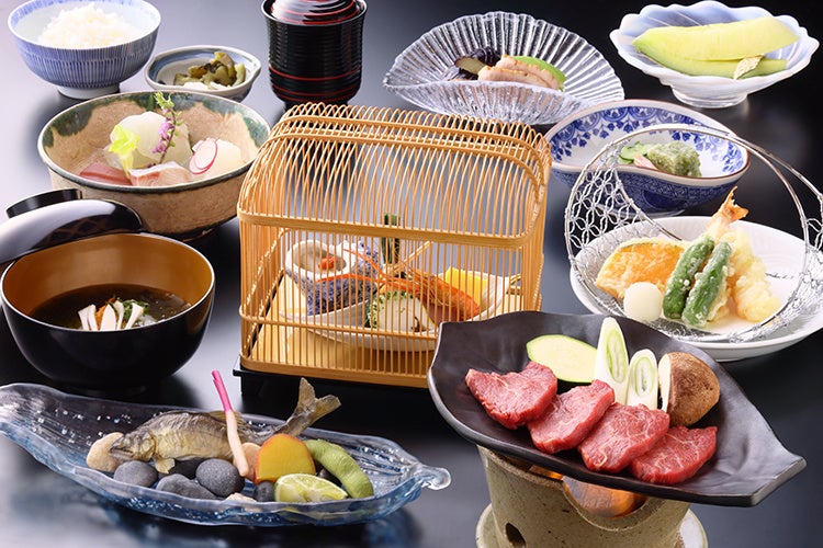 オクラや茗荷など夏野菜を使った前菜にはじまり、琵琶湖名物「小鮎の塩焼」などが見た目も涼やかに盛りつけられ、視覚からも夏を感じられるメニュー。鰻の茶碗蒸しでほっこりとした後、メインの「近江牛トマトすき焼き」は、熱々の陶板鍋で。地元食材を随所に取り入れた会席料理です。