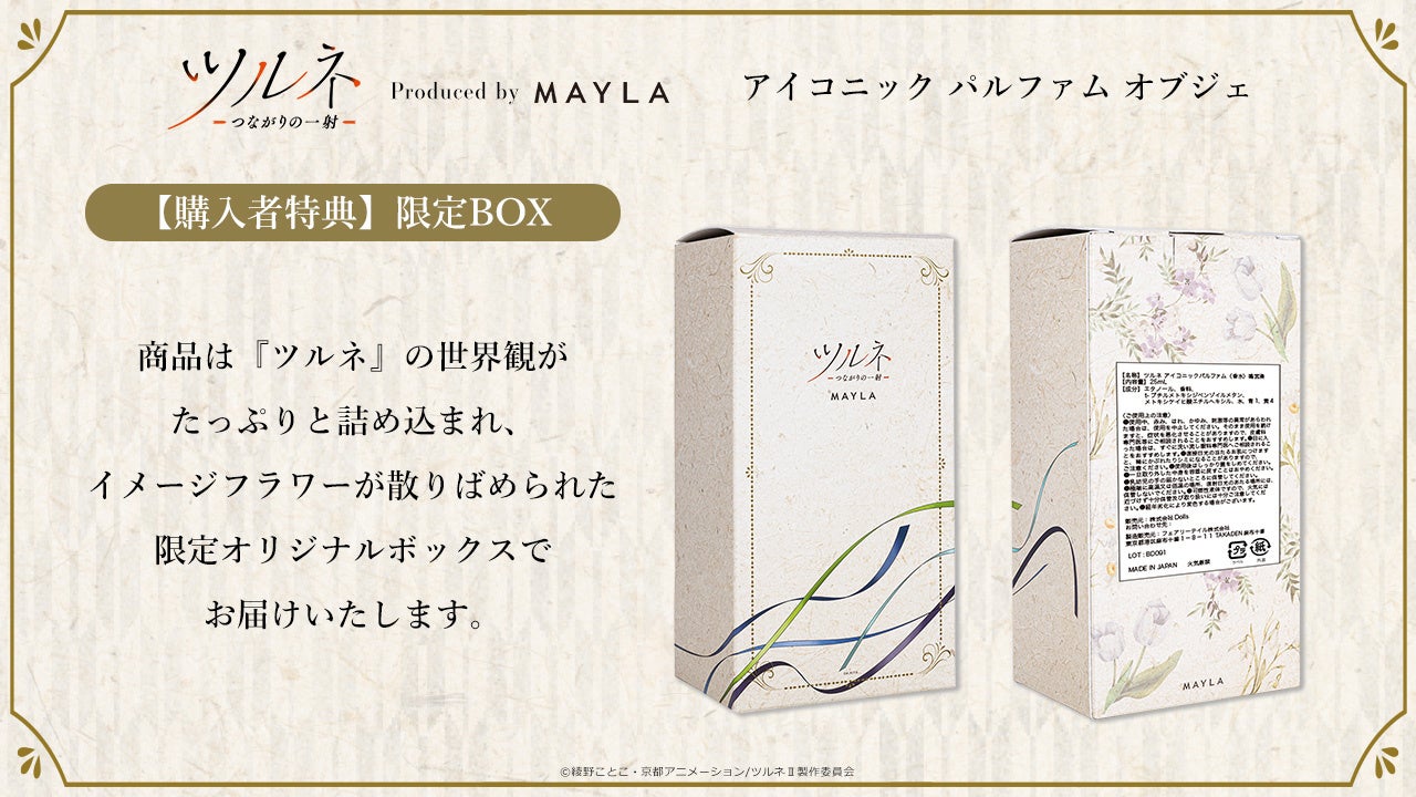 この度、MAYLAは『ツルネ』に登場するキャラクターをイメージしたアイコニックな香水をプロデュースしました。イメージフラワーや世界観を、MAYLA独自の感性で落としこみ、ラグジュアリーなデザインに仕上げております。