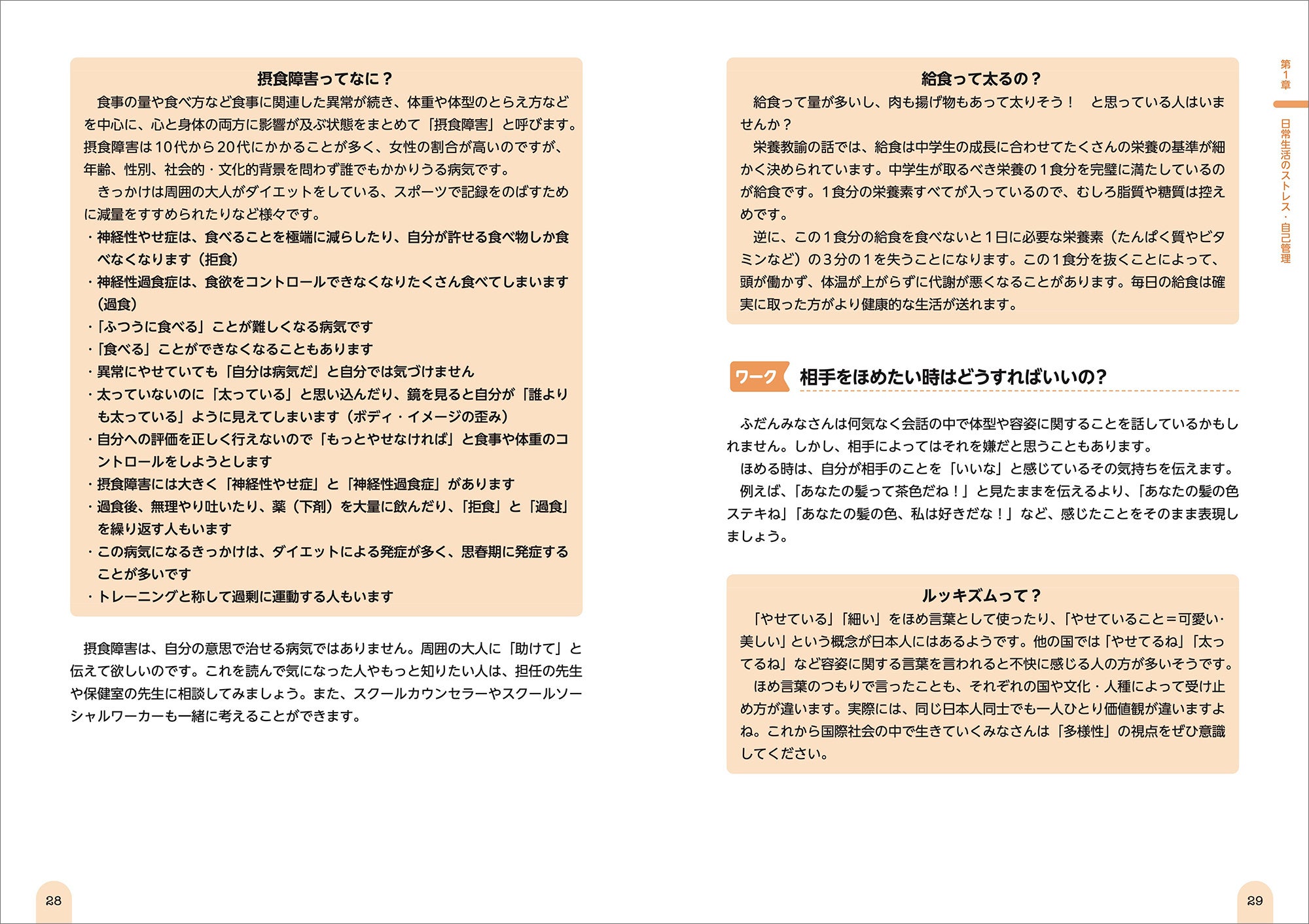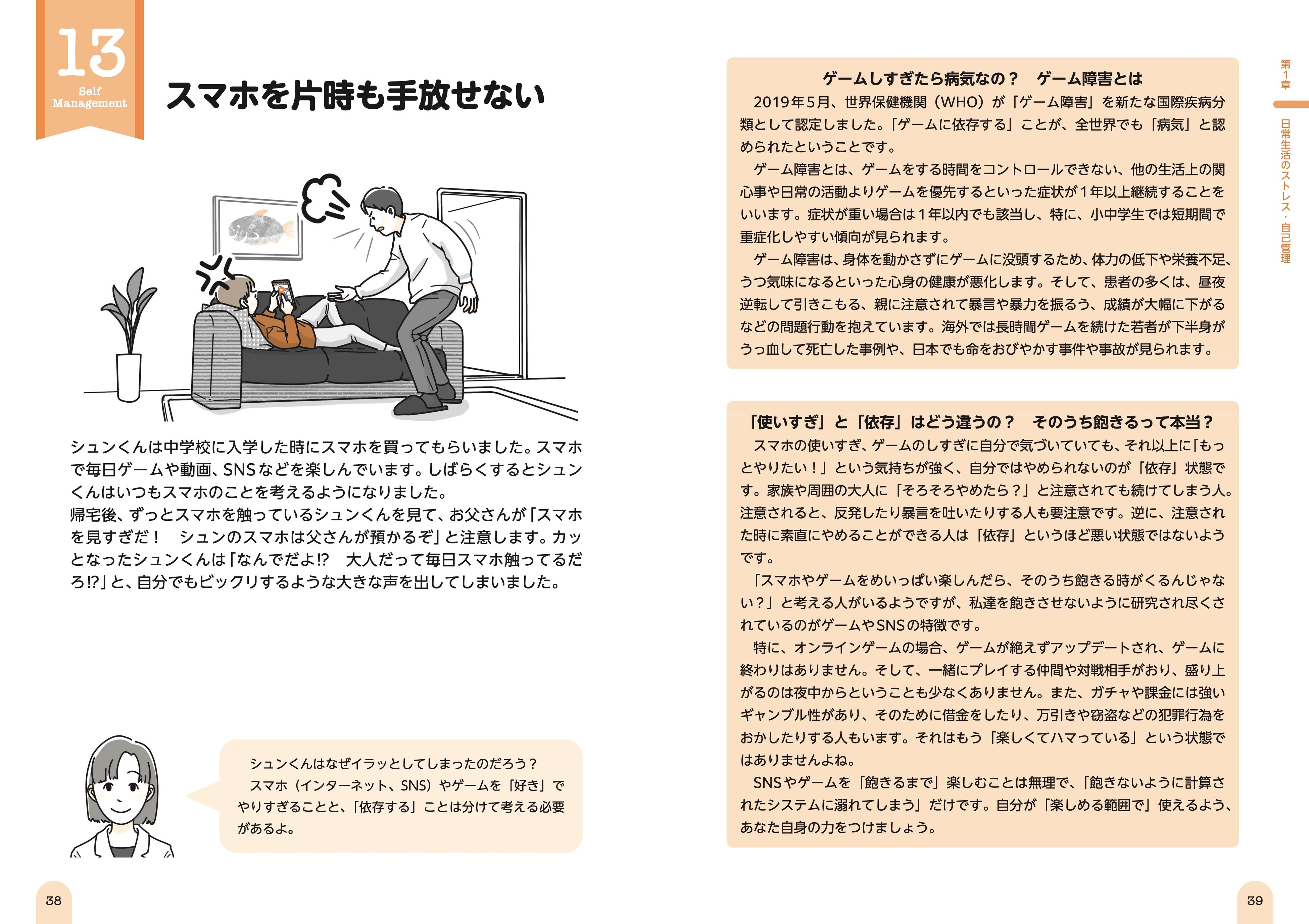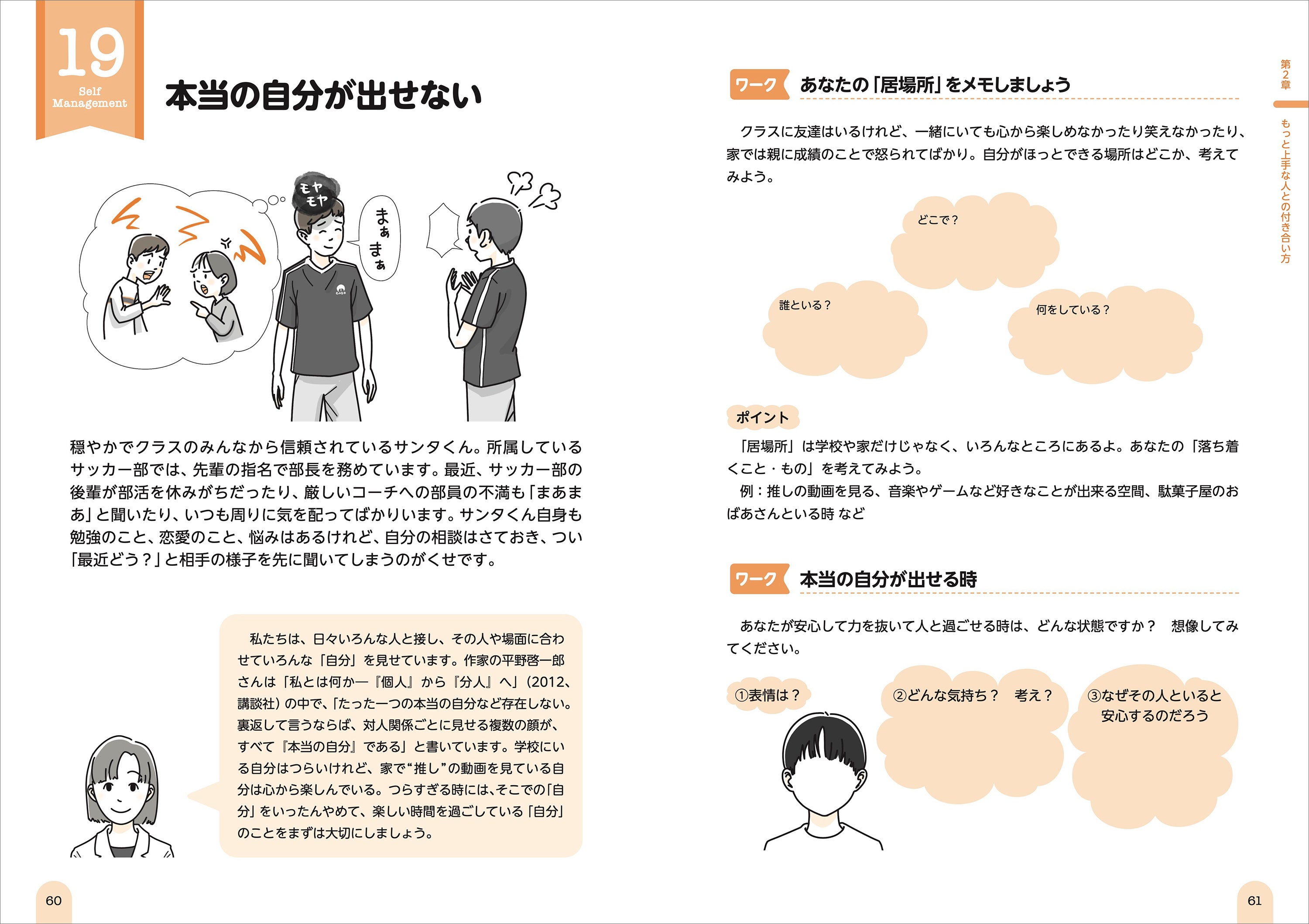 10代の子が直面しがちな悩みを、「日常生活のストレス・自己管理」「人との付き合い方」「恋愛・性・コンプレックス」「家族関係」の4章、33の具体例に分けて紹介し、各項目に自分を知るためのワークがついています。どのページから始めてもOK!悩みに合わせて活用できます。
