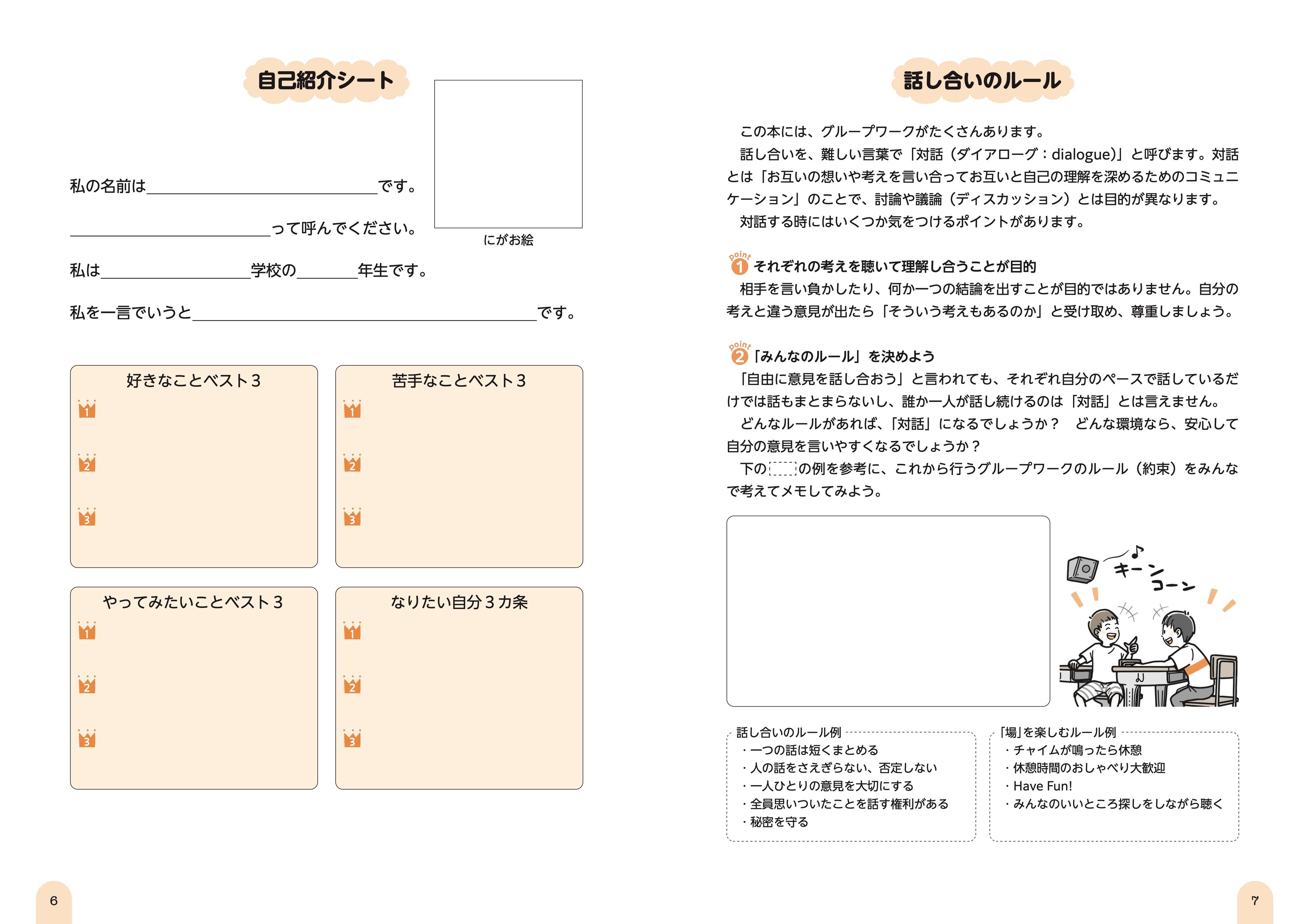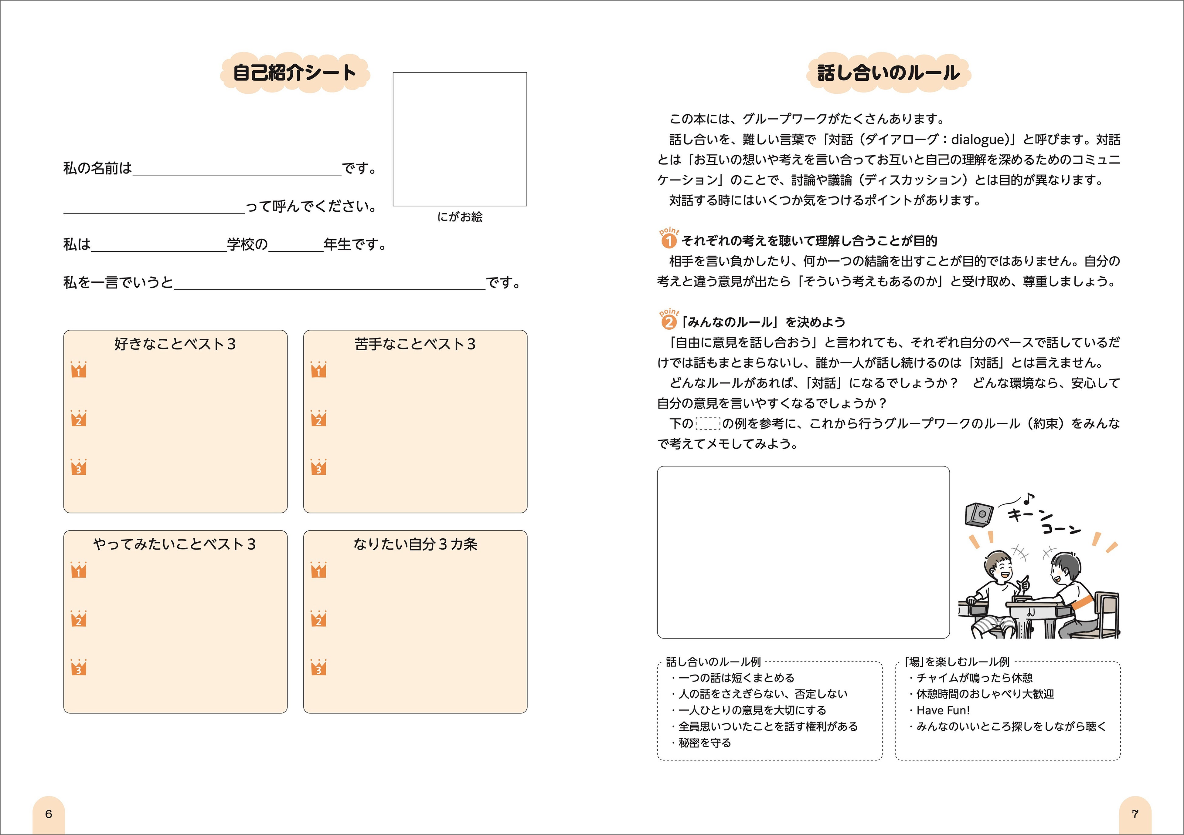 巻頭には、自己紹介シートと話し合いのルールをまとめたページがついています。グループワークの前段階として使っていただくことで、生徒自身が自分のことを振り返り、思いやりを持った話し合いにつなげることができます。