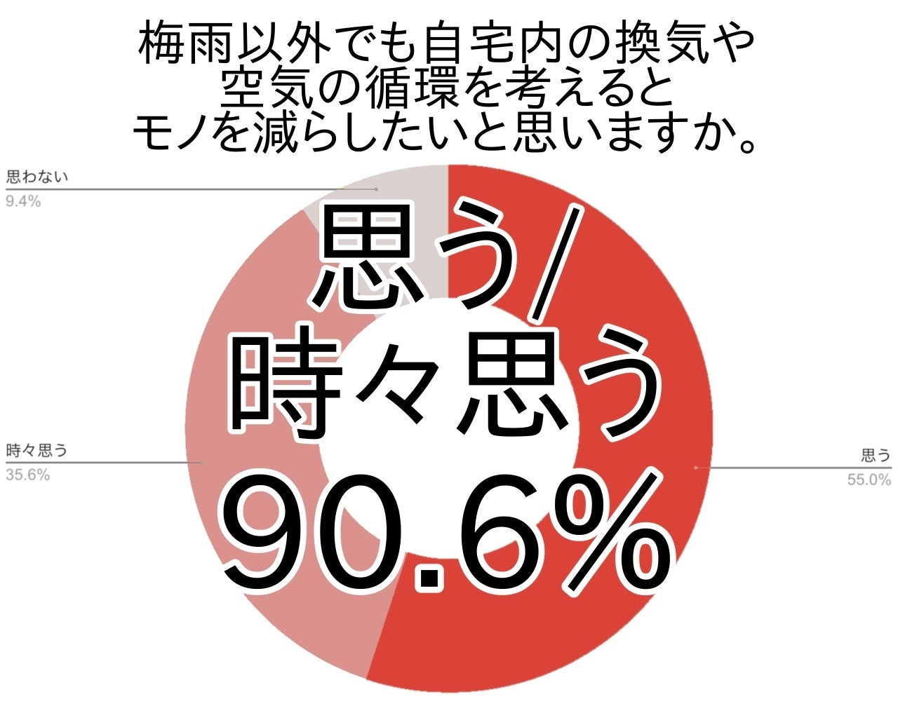 アンケートでは梅雨以外でも自宅内の換気や空気の循環を考えるとモノを減らしたいと思う、または時々思うと答えた方は合わせて約9割(関東90.6%・全国87.3%)でした。