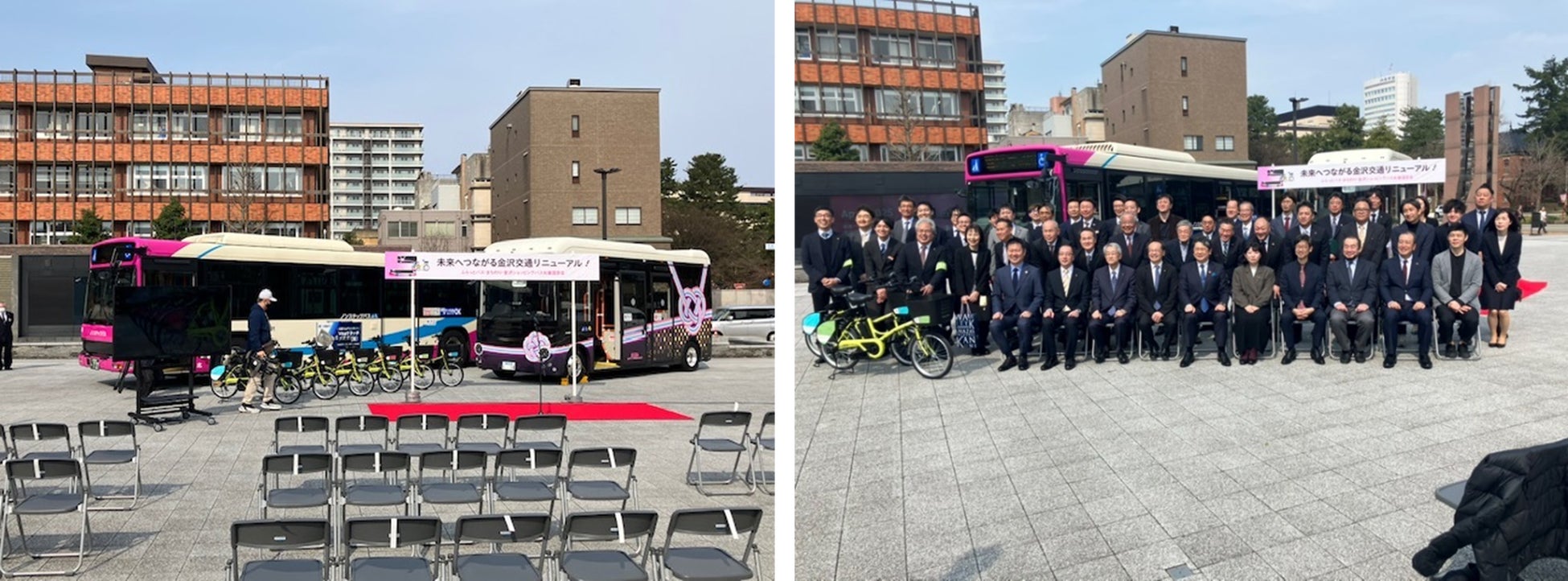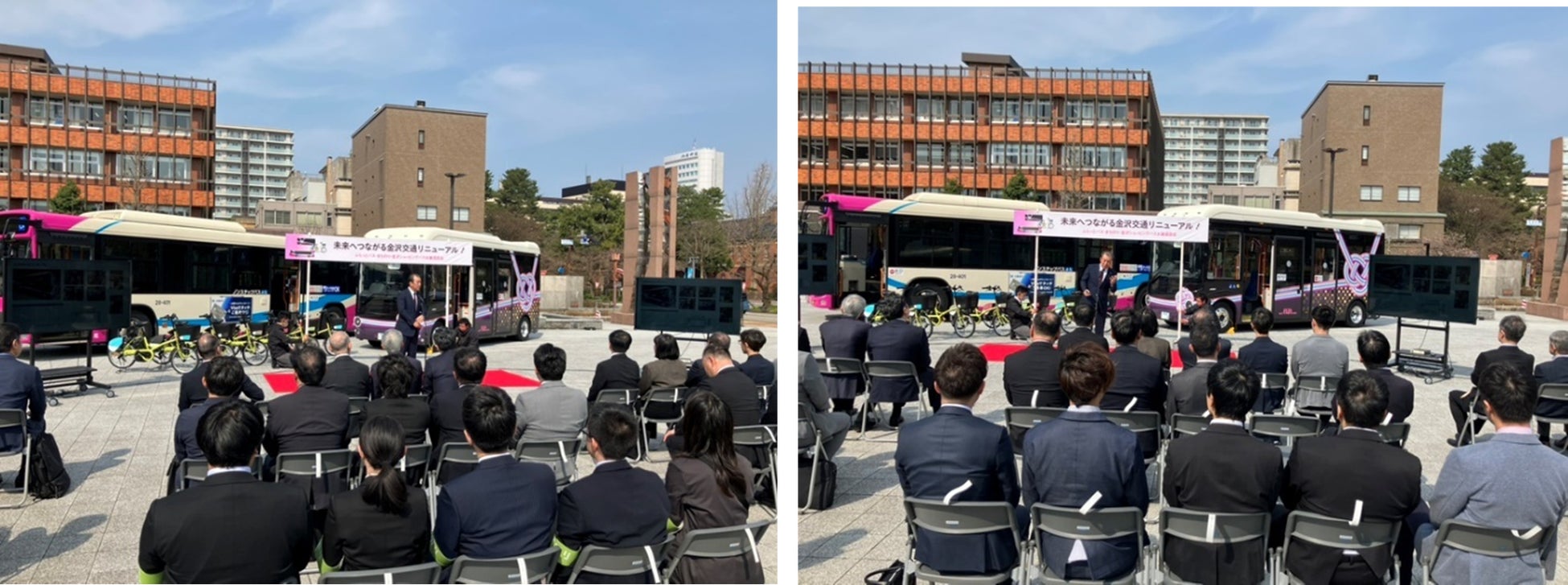 本お披露目会は金沢市の街中の回遊性の向上を担う、金沢ふらっとバス・金沢公共シェアサイクル「まちのり」・金沢ショッピングバスのリニューアルを記念して開催された式典になります。