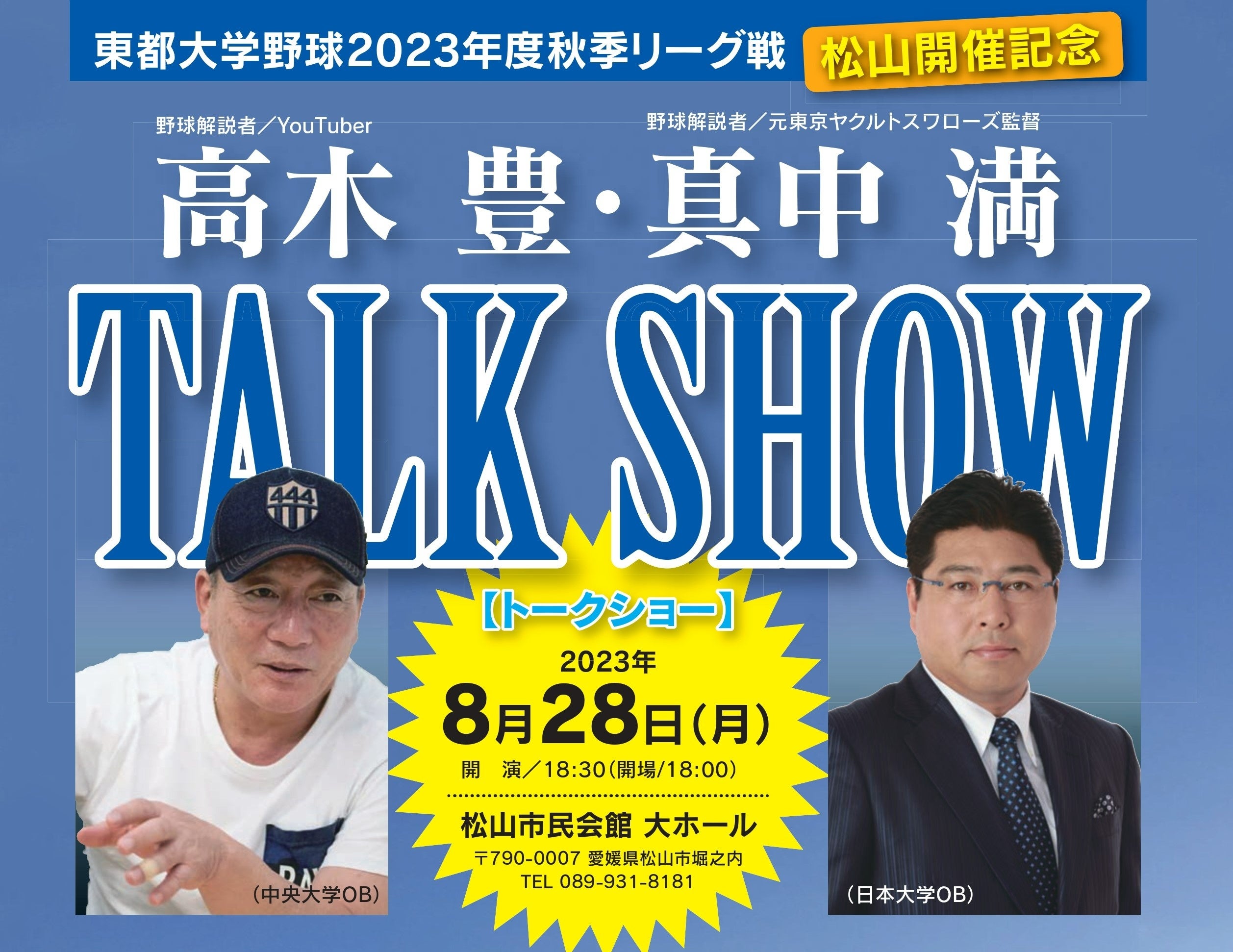東都大学野球連盟が、2023年9月2日から3日間の日程で「令和5年度プレミアムユニバーシティズ22秋季リーグ開幕戦in松山」として愛媛県松山市の坊っちゃんスタジアムで秋季リーグ戦を行うことに合わせて、「東都大学野球2023年度 秋季リーグ戦 松山開催記念 高木豊・真中満トークショー」が開催されます。