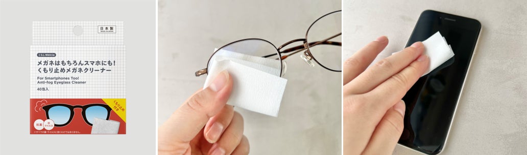 くらしウエルシア「めがねにもスマホにも使える!クリーナー」のリニューアル品です。くもり止め含有量を調整し、拭いた際のくもり止め成分特有のラインが最小限になるよう調整しました。また、速乾セミウエットシートなので、拭き跡が残りにくいのも特徴です。特殊くもり止め剤配合で、拭いた後のレンズのくもりを防ぐほか、抗菌・抗ウイルス効果もあるためメガネを清潔に保つことができます。 一回使い切りの個包装タイプで携帯にも便利で、メガネ以外にスマートフォン・タブレット・ゴーグル・ヘルメットシールドにも使用可能です。