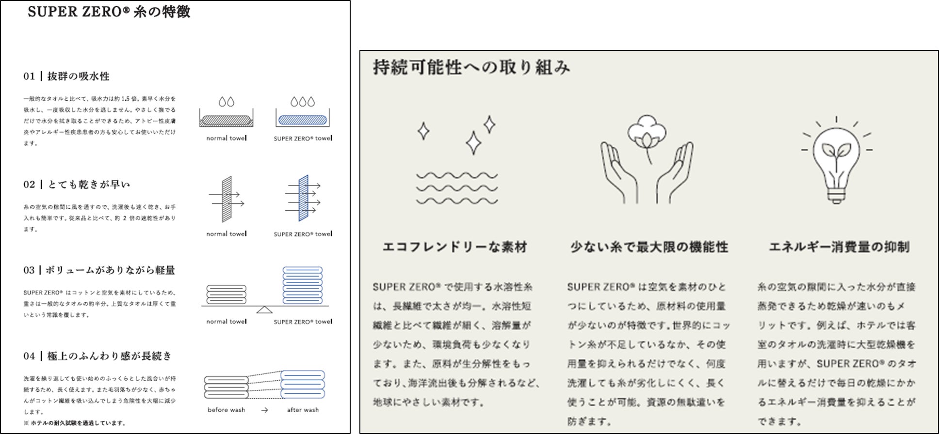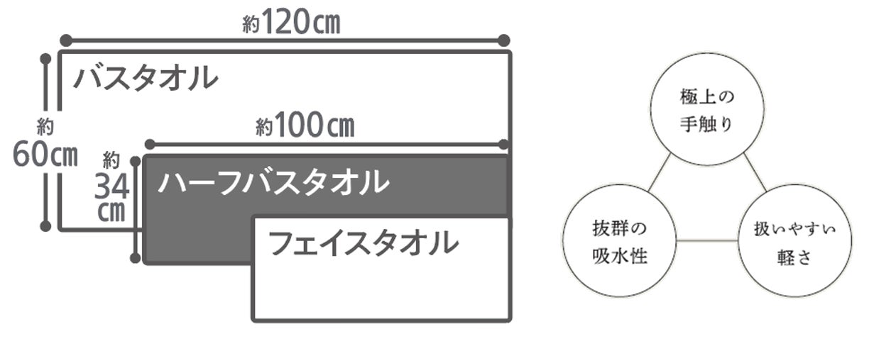 特許製法の糸『スーパーZEROⓇ』を使用し、空気をたっぷりと含み軽やかな使い心地を実現しました。バスタオルの半分のサイズなのに吸収力はバスタオル並みなので乾くのも早く、時短に繋がります。