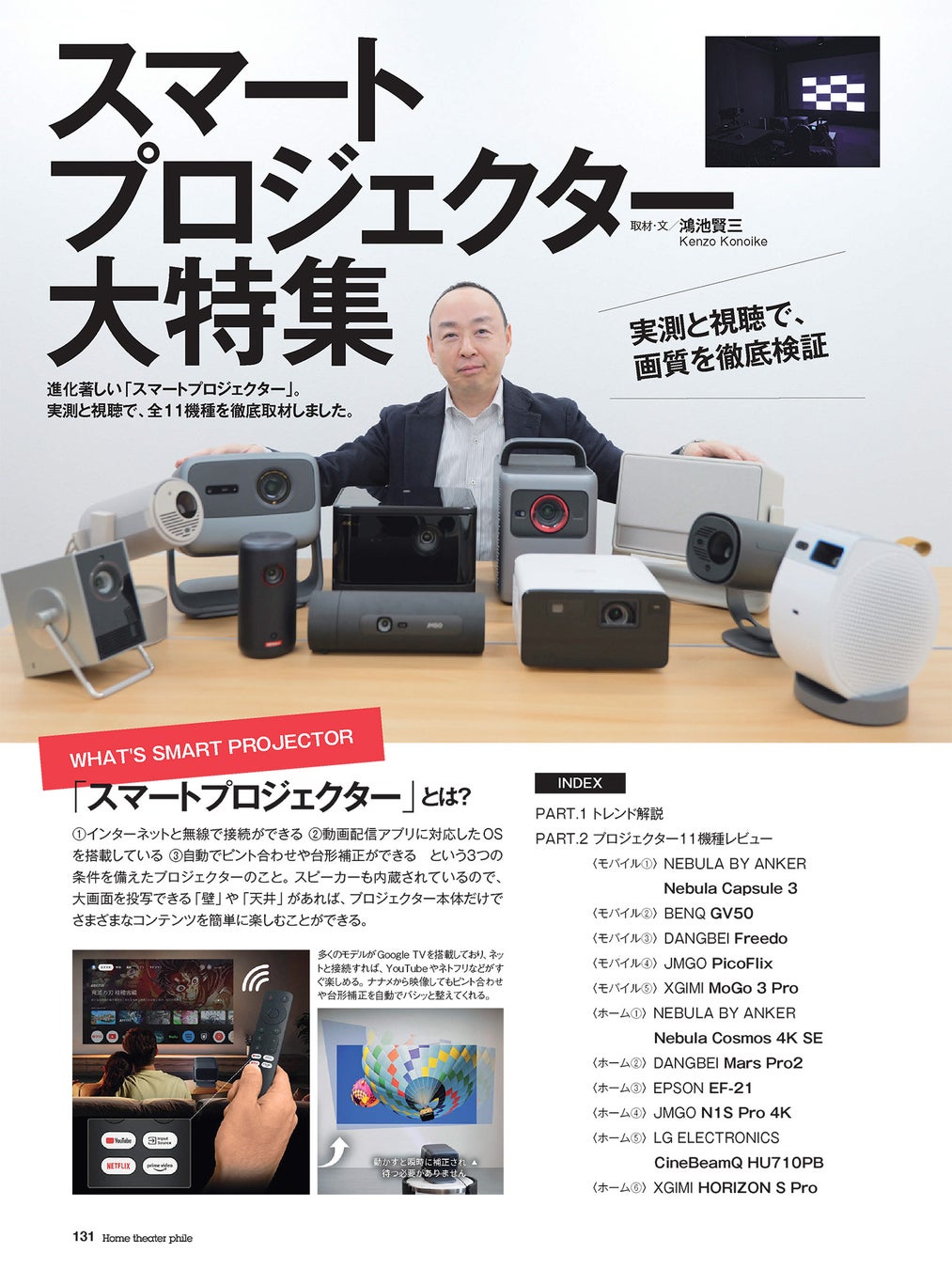 本特集では、合計 11 モデルを徹底検証。スマートプロジェクター選びに役立つ基礎知識やトレンド解説に加え、業務用の色彩輝度計などを用いた実測により色域の広さや色再現の精度をグラフで確認しながら、視聴 & ハンズオンと織り交ぜ、詳細に各モデルの実力を検証・評価しています。