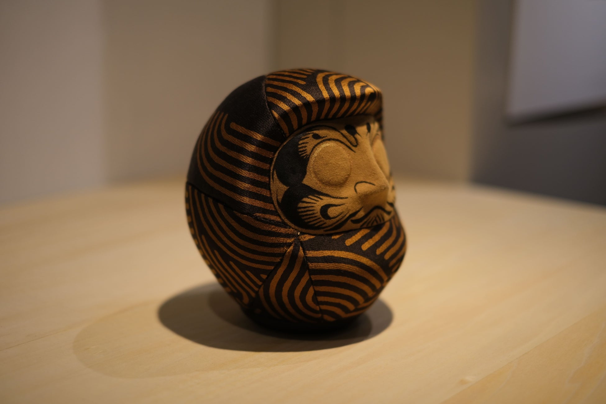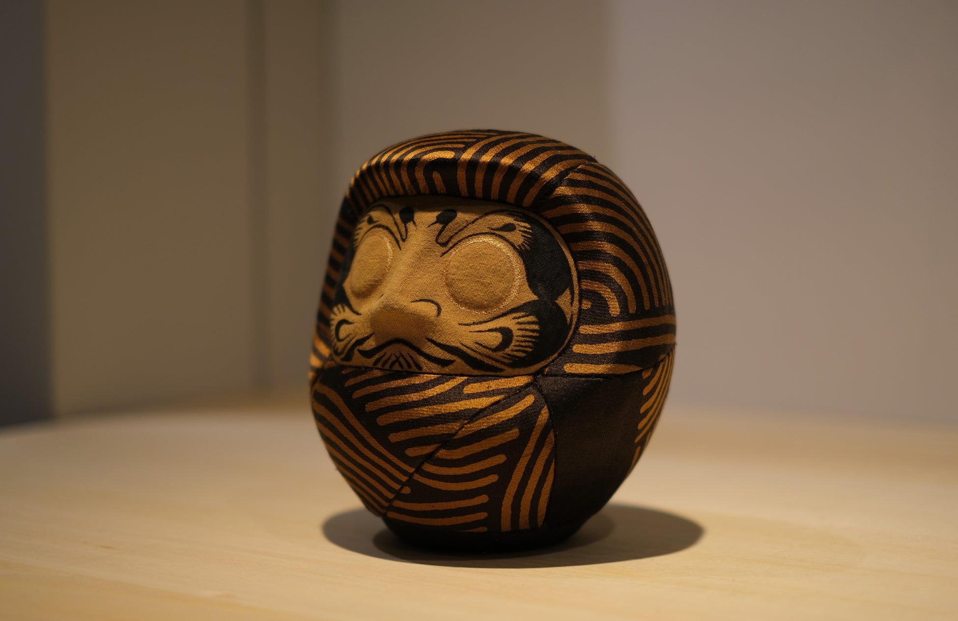 「だるまや和田清商店」のだるまから型を制作し、木目込にてお茶染め生地を着付けた作品。