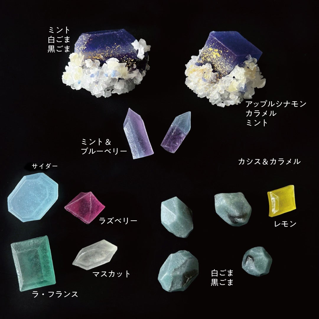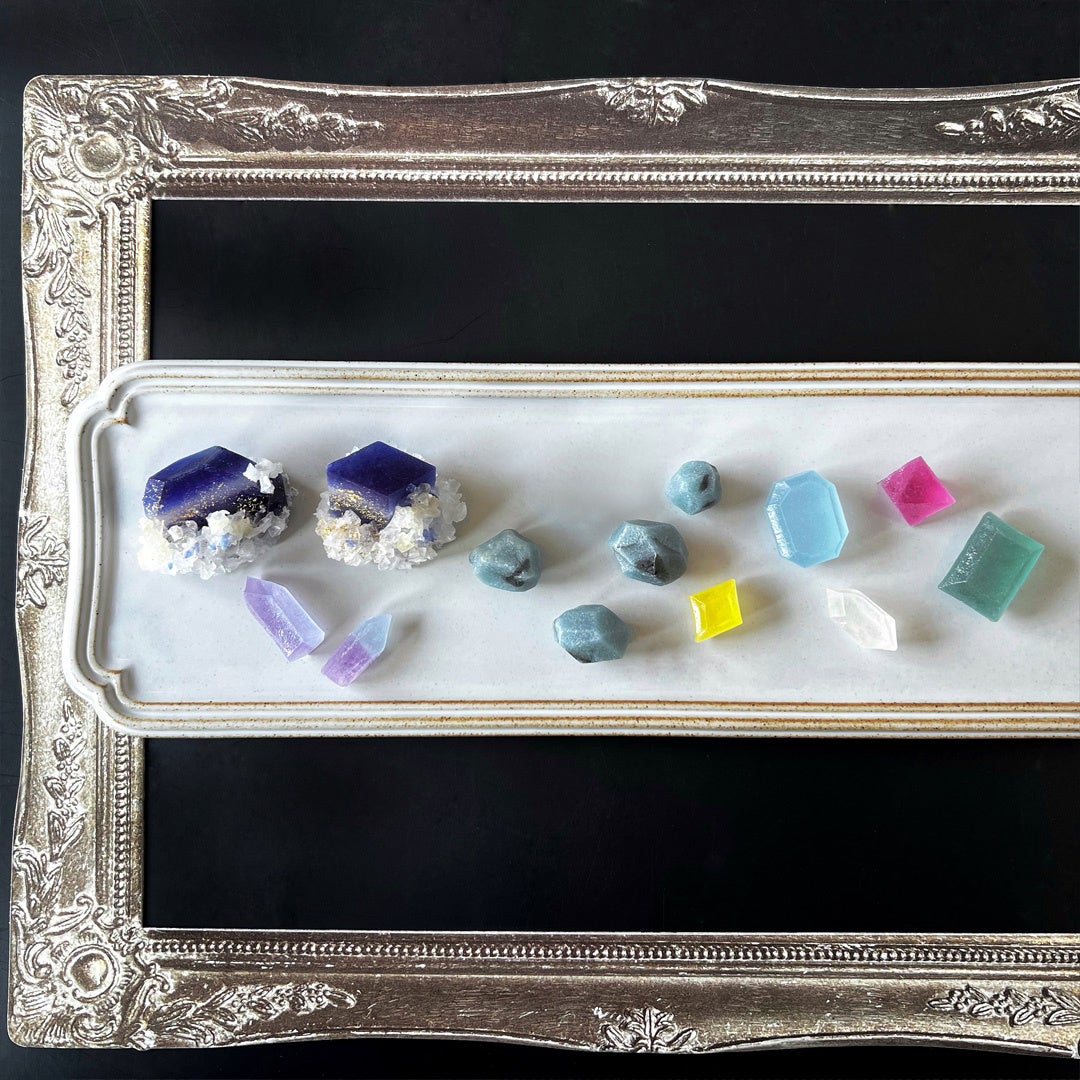 毎月一か月間だけお作りする誕生石のこうぶつヲカシ。日本の伝統的和菓子、琥珀糖を手切りの技術で宝石や鉱物のように形作っていきます。12月の誕生石である、ラピスラズリ・ターコイズ・ジルコンのさまざまなブルーやグリーンの鉱物たちを表現しました。 幾層にも重なる青、白、黒のグラデーションが特徴的なラピスラズリや、特徴的な模様のターコイズ(トルコ石ともよばれる)など、本物の鉱物のような造形にこだわったこうぶつヲカシをデザインし詰め合わせました。どれも綺麗なブルーの輝きが魅力的な石たちを濃紺の化粧箱でお届けします。
