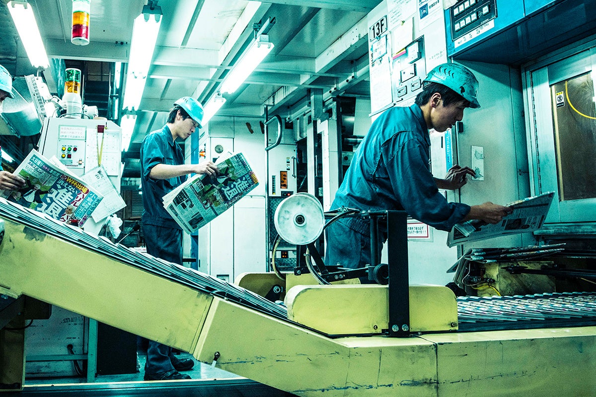 輪転機は1分間に1,000部以上の新聞を刷ることができます。オペレーターは刷りたての新聞を取り、紙面チェックを頻繁に行います。品質にあった紙面が印刷されているかを人の目でチェックします。品質のズレをいち早く発見し、ズレの修正を素早く行います。