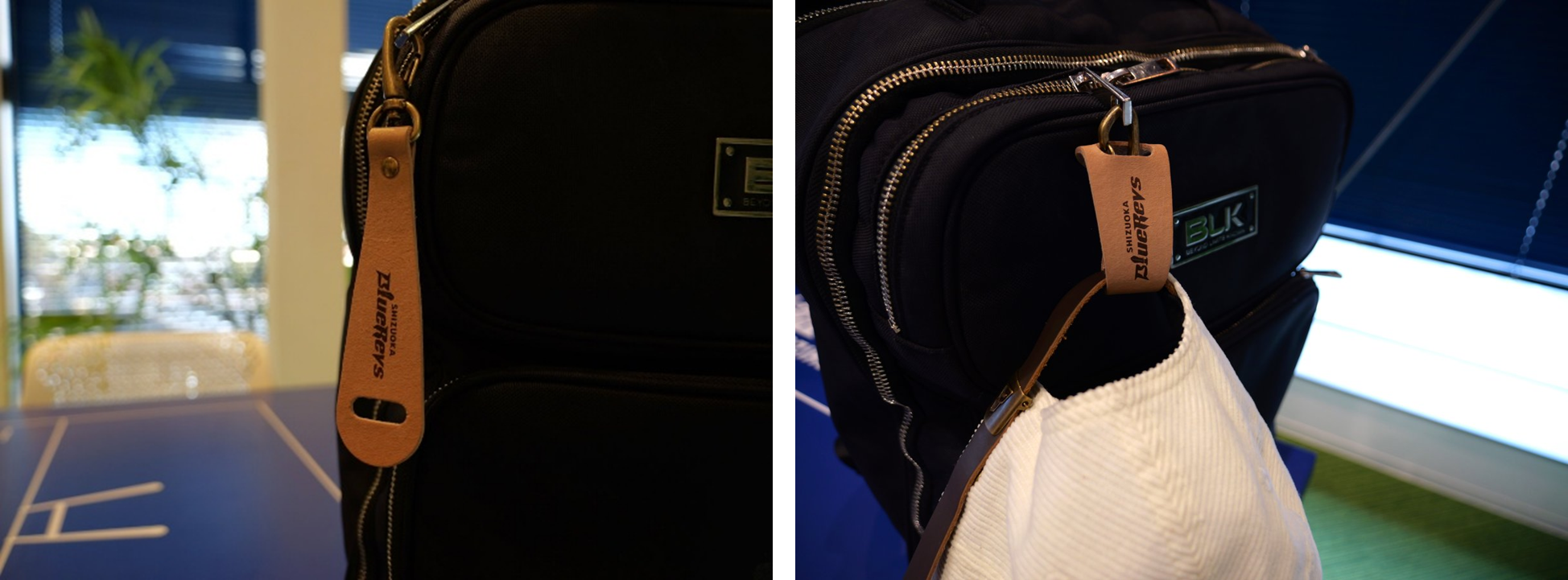 静岡県産のジビエレザーを使用し、ブルーレヴズのロゴが刻印された特製キャップホルダーです。バックの持ち手やショルダーストラップに取り付けてお使いください。また使うほどにレザーの味わいが増す商品となっております。