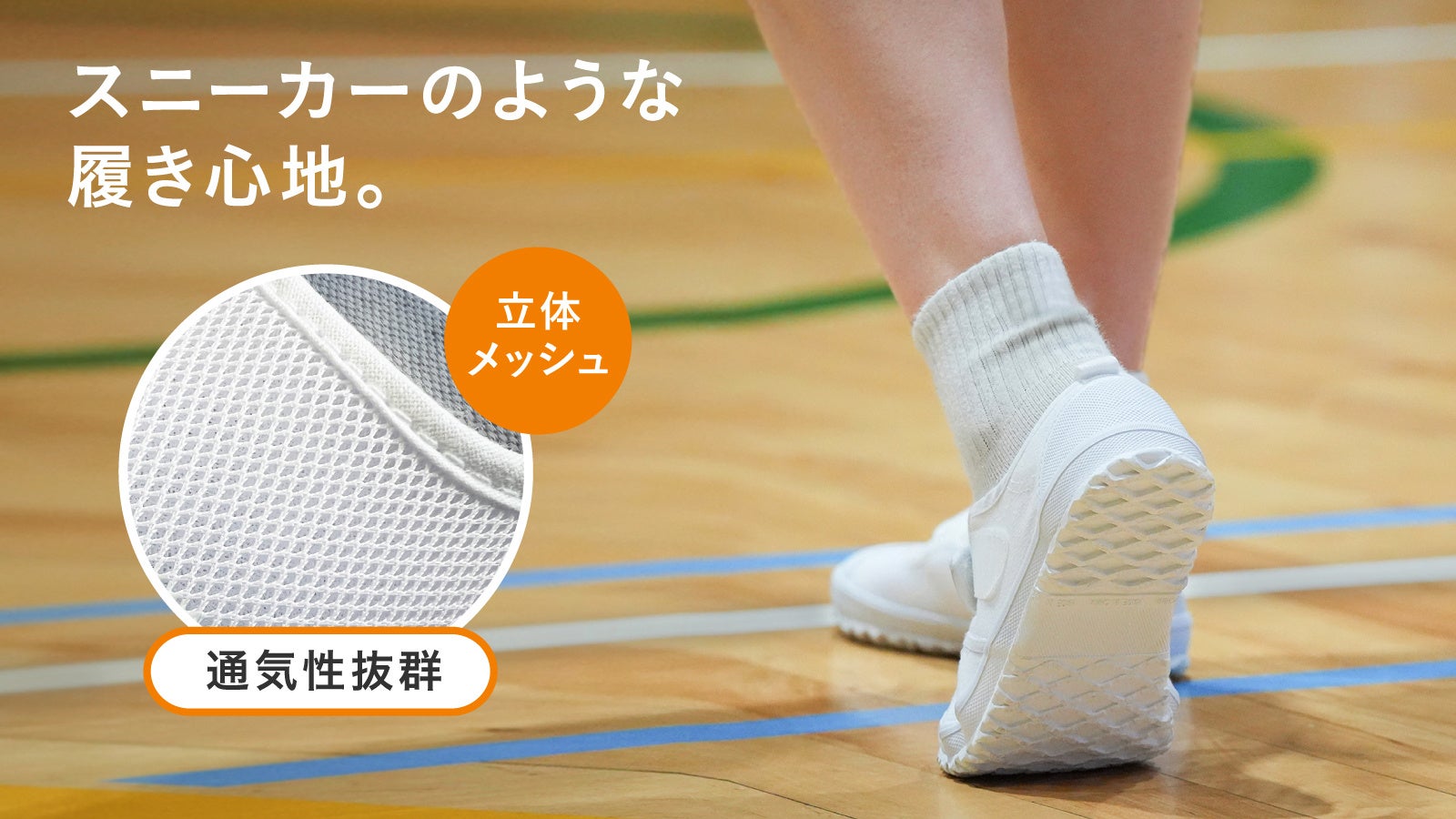 高反発インソールが歩行をやさしく支え、通気性の高いメッシュ素材がムレを防ぎます。体育や通学時も疲れにくく、学校生活を快適にサポートします。