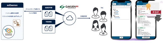 当社が提供する戦略的大学経営システム「GAKUEN シリーズ」と、セイコーソリューションズが提供するPDFファイルに電子署名及びタイムスタンプを付与することができる「eviDaemon for PadES」(※1)との連携により、学生がWebサービスシステム「UNIVERSAL PASSPORT」から真正性を担保したデジタル証明書をワンストップで申請・発行可能となります。
