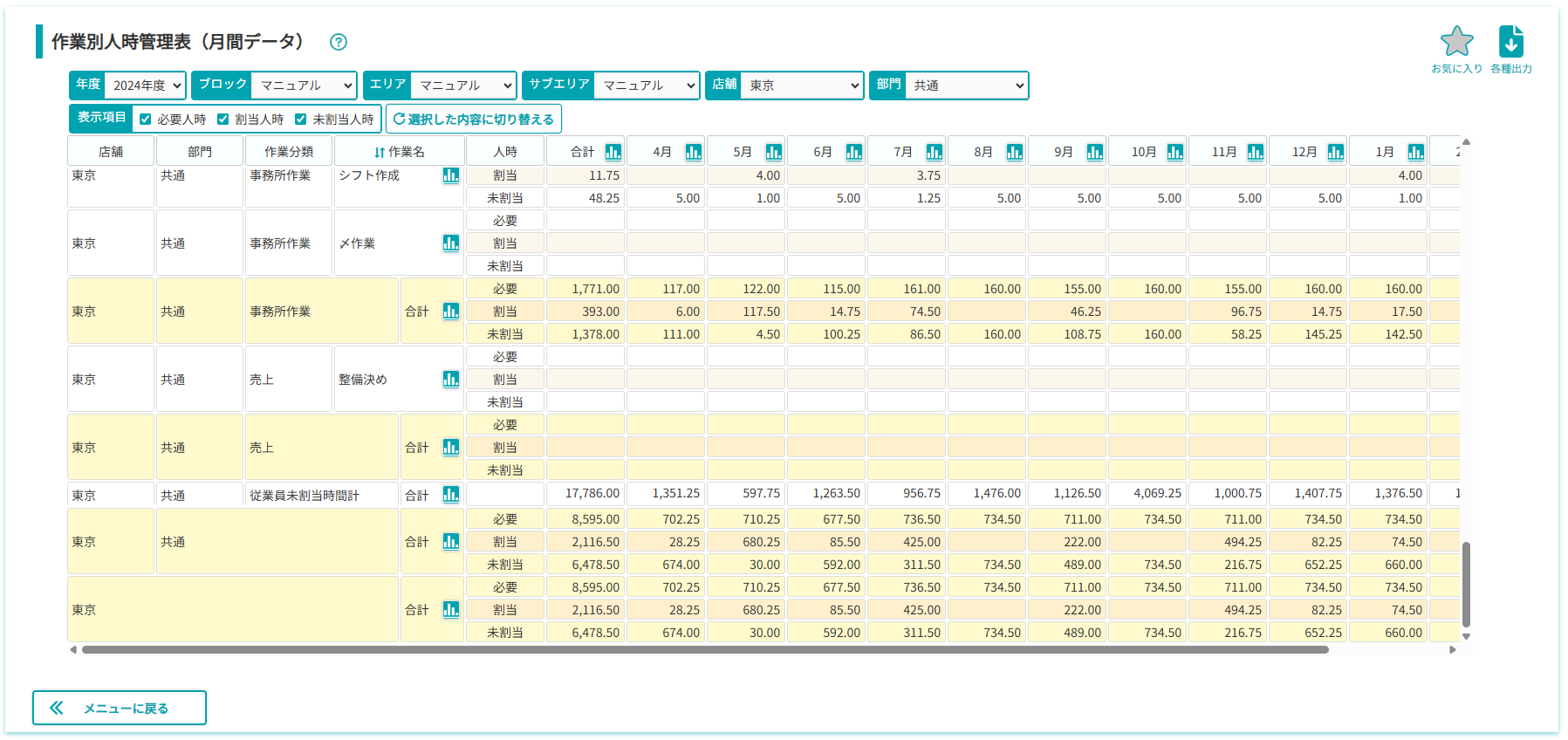 「作業別人時管理表」は、R-Shiftのオプション機能「人時管理」の中核を担う集計画面です。店舗ごとに「どの作業に・誰が・どれだけの時間を費やしたか」を一覧で可視化し、人件費の最適配分や生産性の改善検討に活用されています。