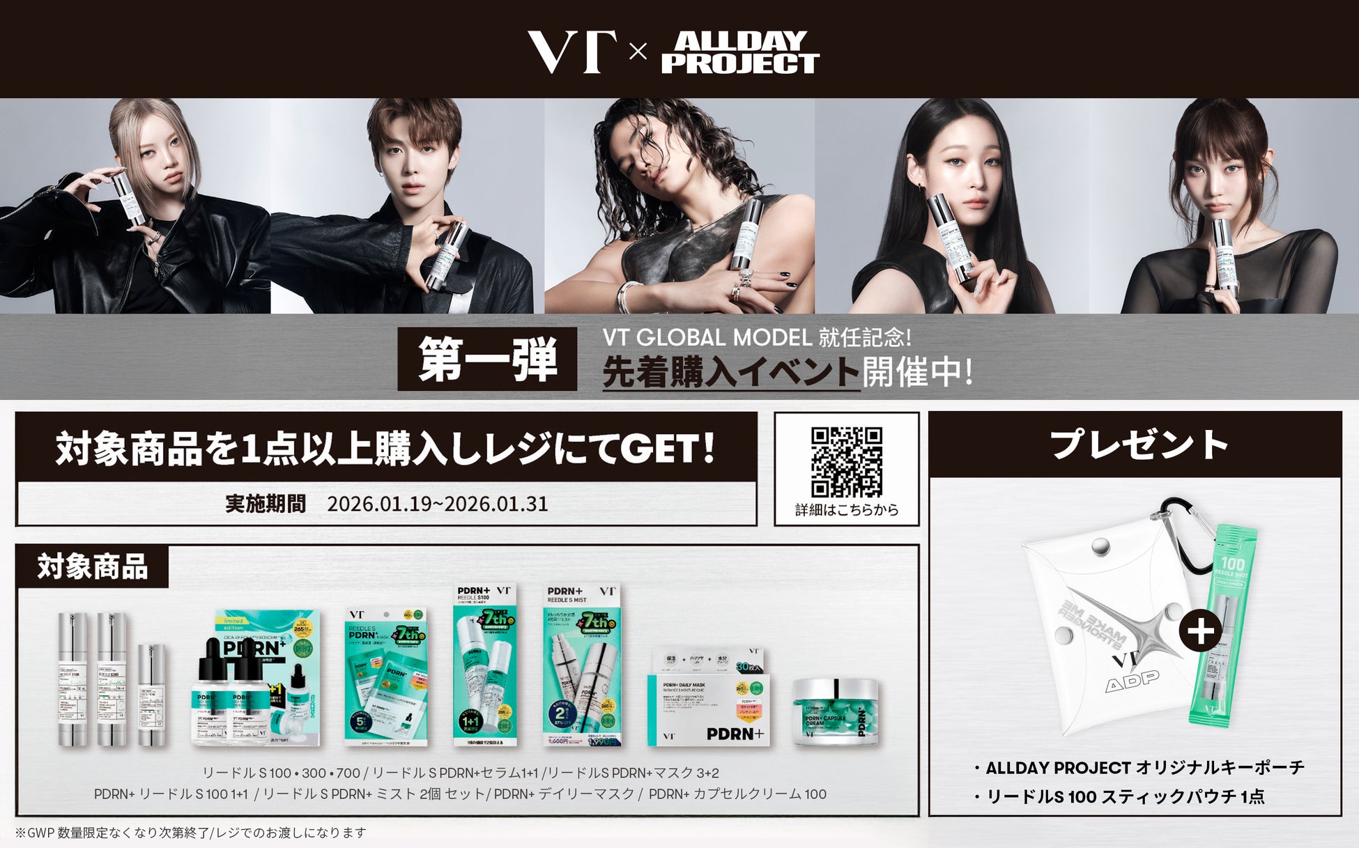 ALLDAY PROJECTのGLOBAL AMBASSADOR就任を記念し、キャンペーン期間中にVT商品をご購入いただいたお客様を対象としたレシート応募キャンペーンを実施いたします。