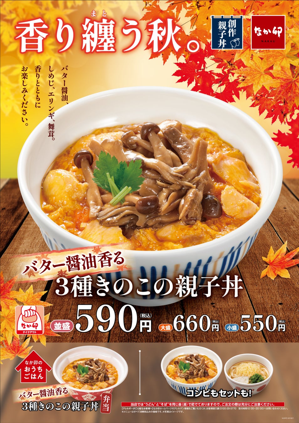ぜひこの機会にお近くのなか卯やご家庭で、秋の味覚を感じられる「3種きのこの親子丼」をお楽しみください。