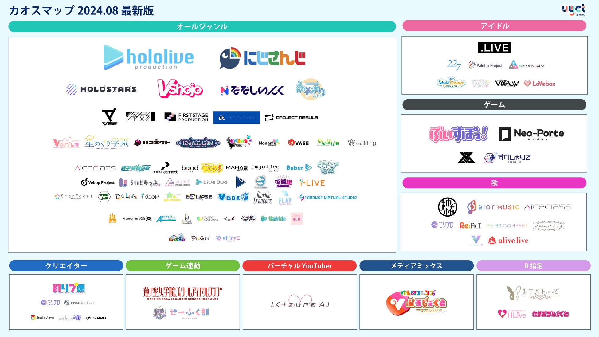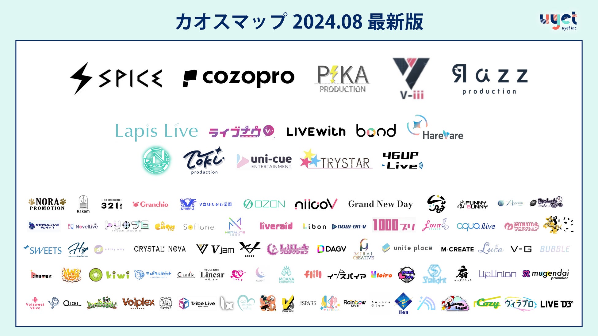 VTuber、IPコンテンツを通して日本と世界で新たな流通を生み出す“IPコンテンツの総合商社”株式会社uyet(ユエット)(本社:東京都渋谷区、代表取締役:金井洸樹・梶田大樹)は、「VTuber/Vライバー事務所カオスマップ【2024年8月ver.】」を公開させていただきました。