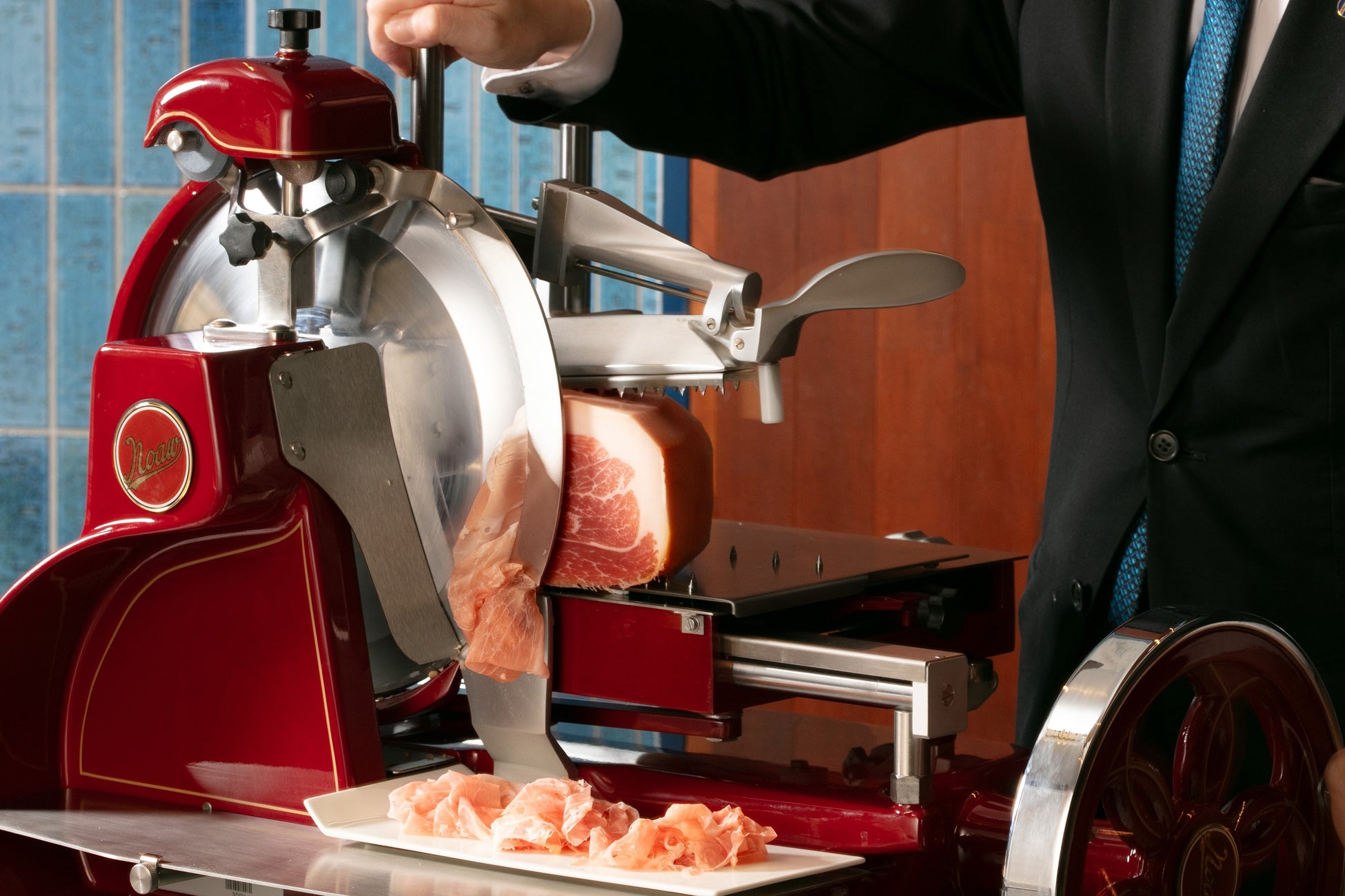 お客様の目の前で専用スライサーを使用して切り落とします。スライサーはこだわりの一機。刃が生ハムを切る際の摩擦熱が、風味を落としてしまうため、熱の入らない手動スライサーを使用。より薄くスライスされることで、生ハムの塩味や香りをお愉しみいただけます。