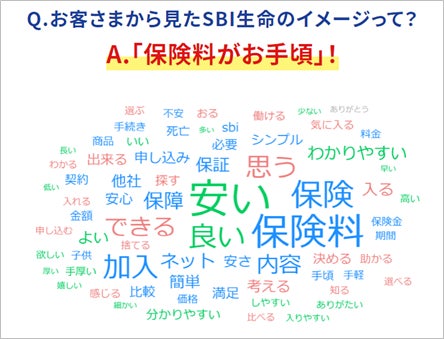当社の保険にご加入いただいたお客さま向けアンケート(※1)にて、SBI生命へのご意見を募集しました。ご回答を画像で可視化すると上の画像イメージになります。より多くのご回答があった単語ほど、大きな文字で表示されています。多くのお客さまから「安い」というイメージを抱いていただいていることがわかります。