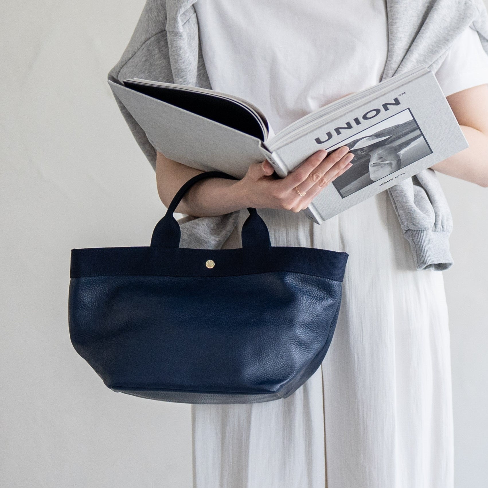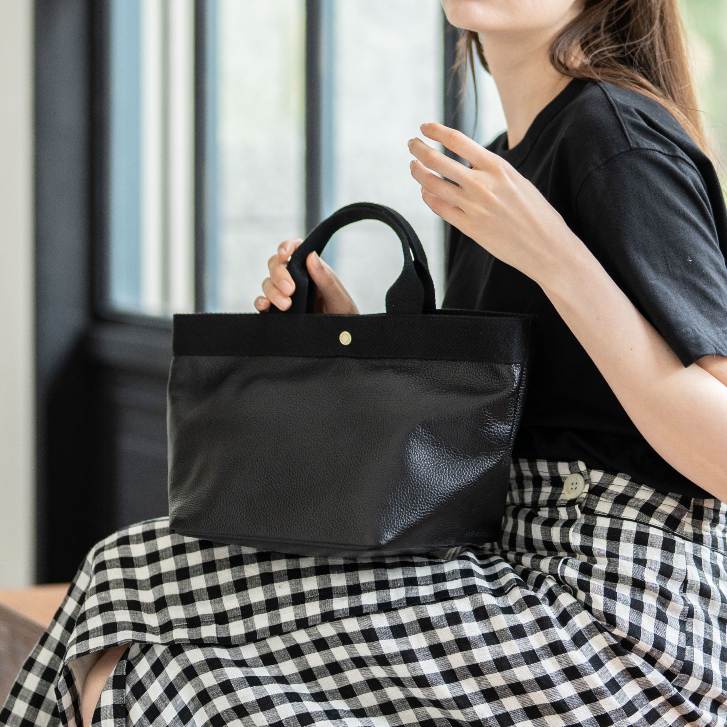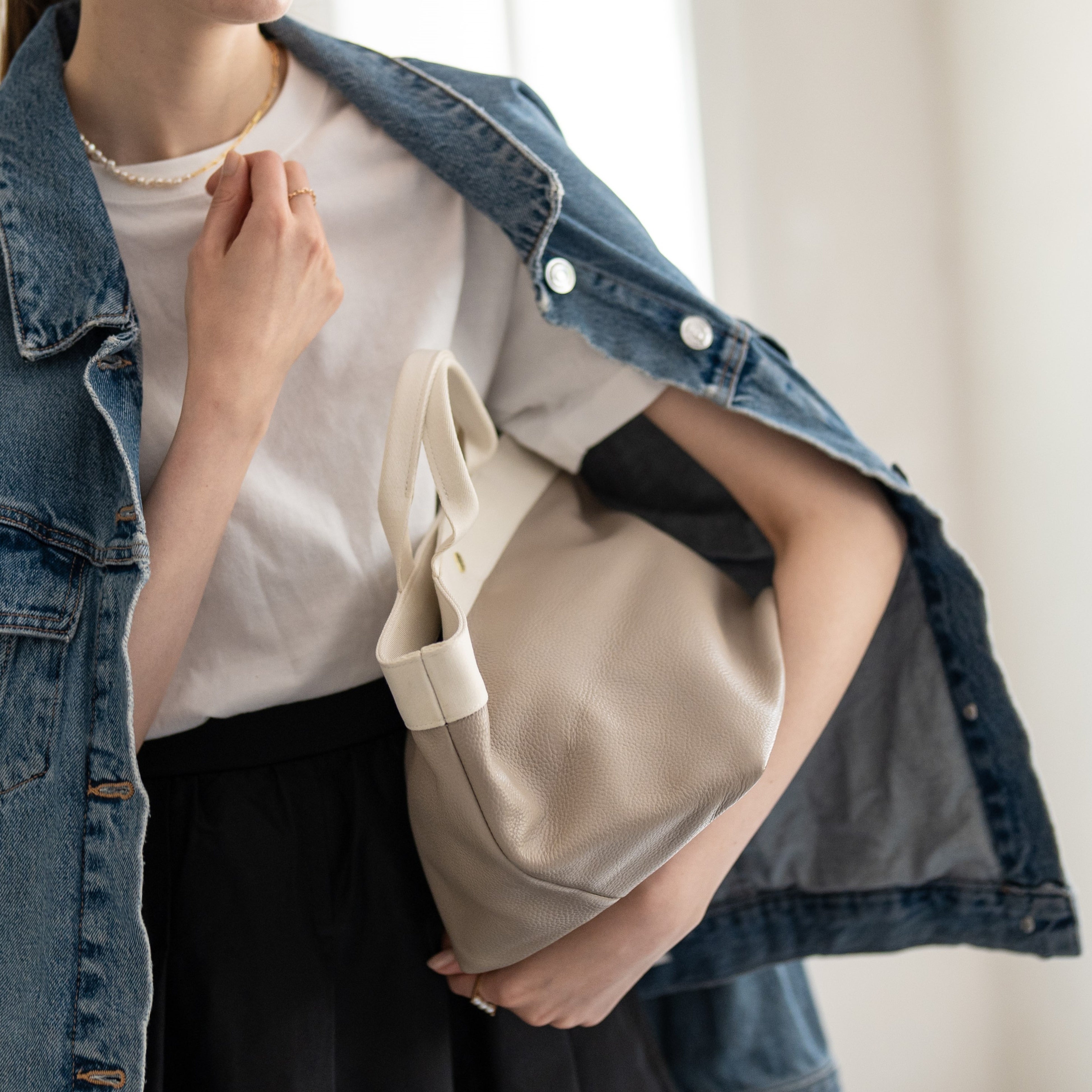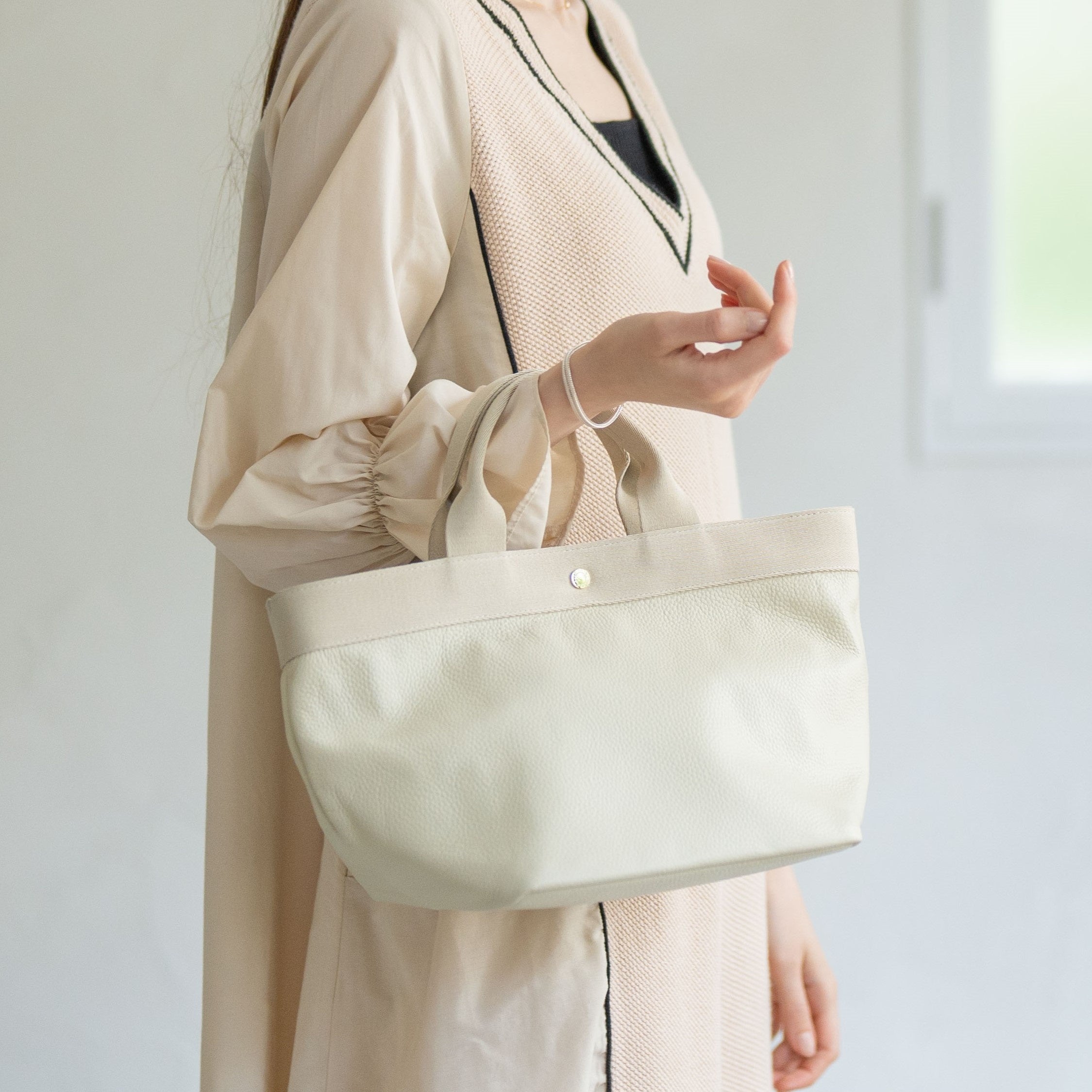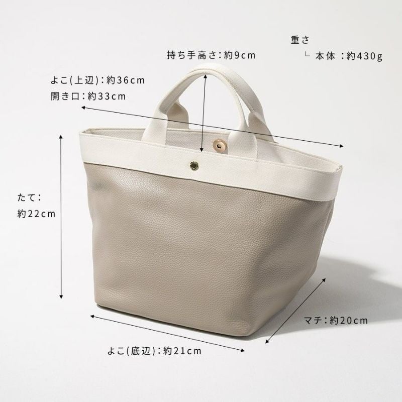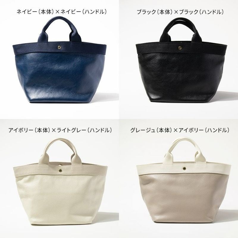 適度なツヤ感としっとりした肌触りの本革に、異素材のハンドルを組み合わせて、こなれた雰囲気に仕上げました。