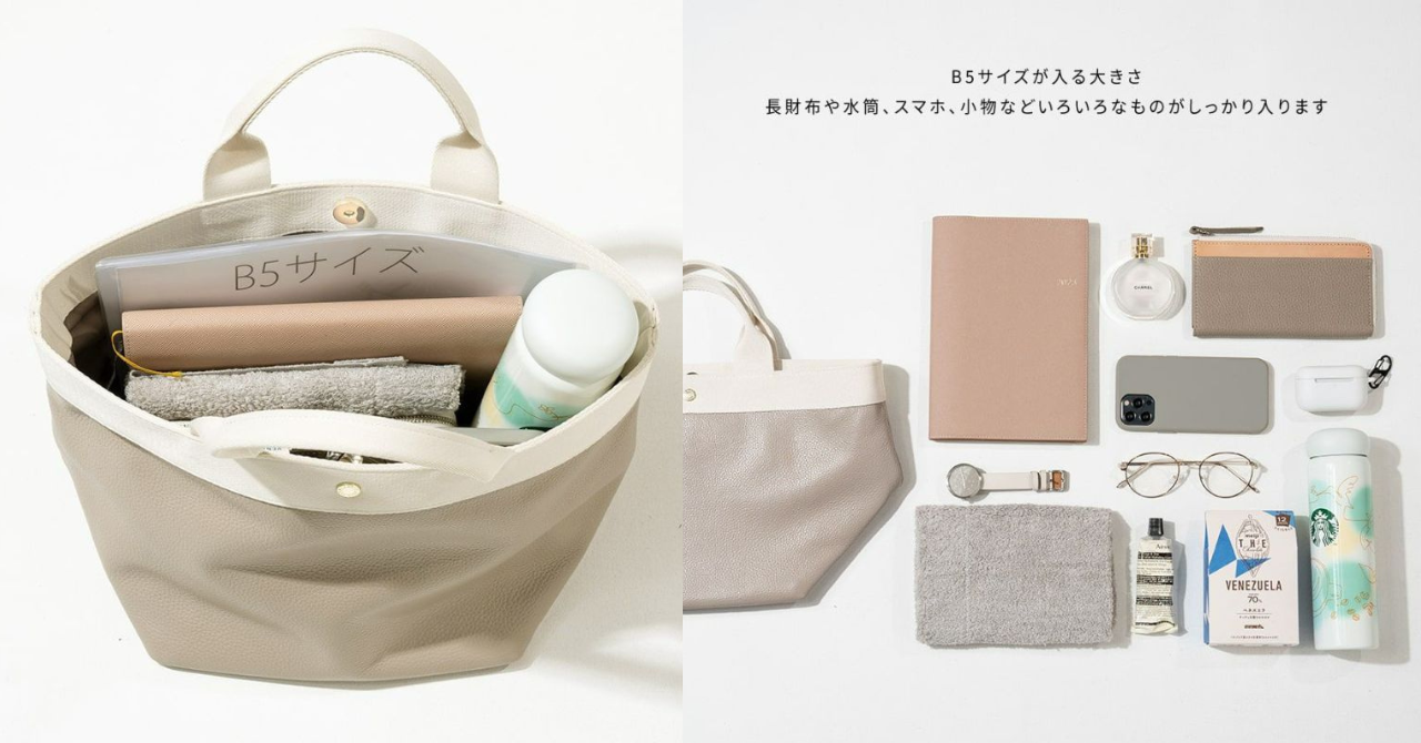 長財布やポーチ、手帳、エコバッグなどお出掛けの必需品が収まる使い勝手の良いコンパクトなサイズ感です。