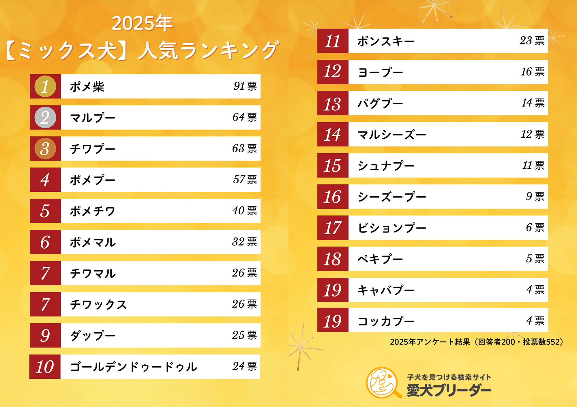 ミックス犬ランキングの第1位はポメ柴で、ここでも柴犬の根強い人気がうかがえます。続いて、2位はマルプー、3位はチワプー、4位はポメプーという結果となり、トイプードルを親に持つミックス犬種が特に人気であることが分かりました。