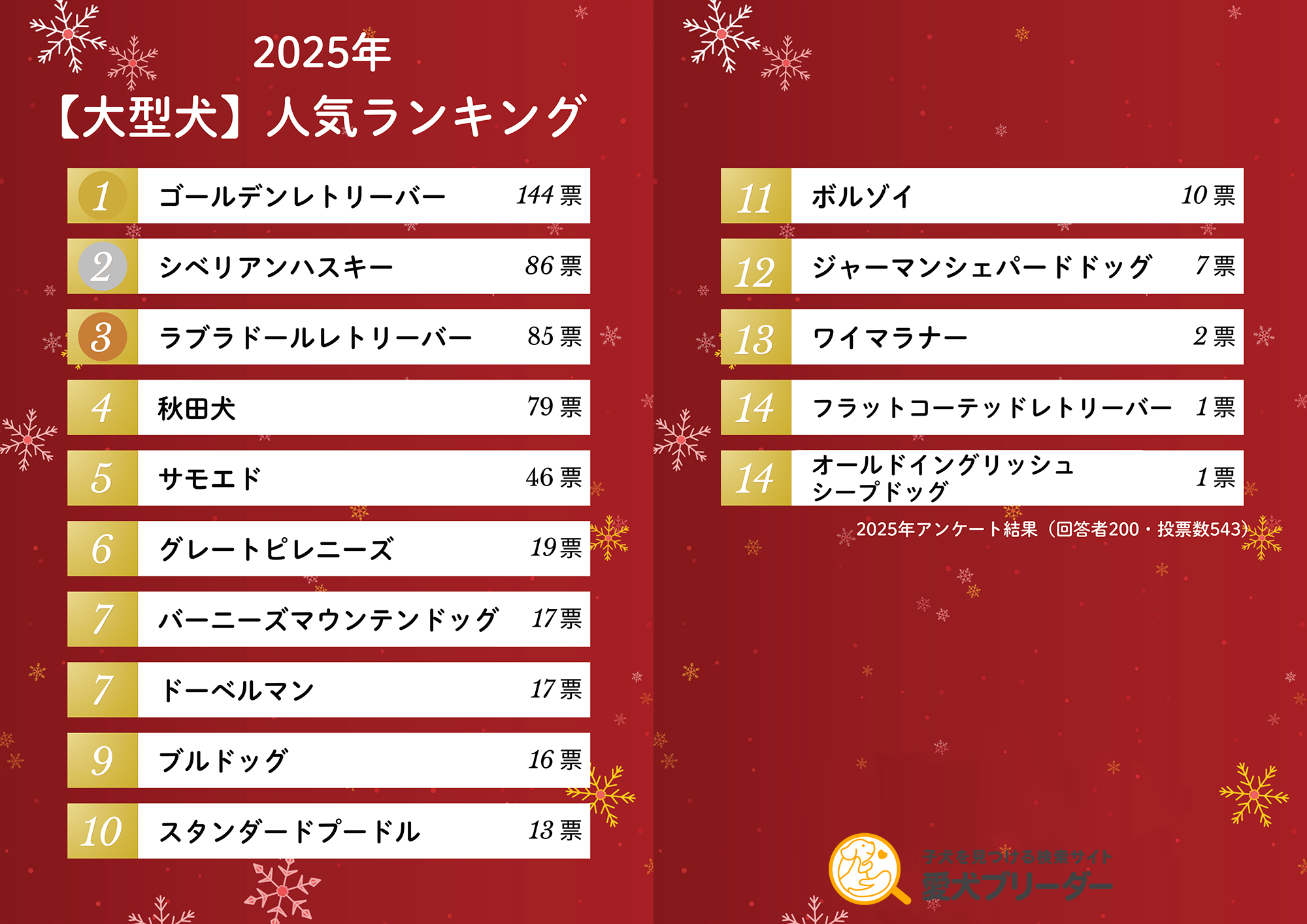 大型犬の中でも、性格の穏やかさや人懐っこさ、見た目の魅力が支持の理由となっていることがうかがえます。
