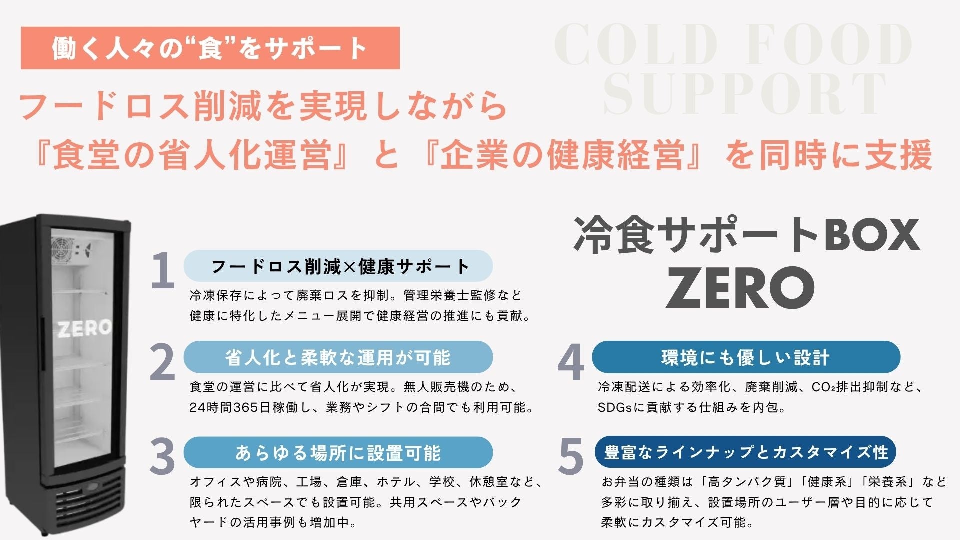 ZEROは、『冷食サポートBOX ZERO』を通じて、こうした現場での栄養補給・健康経営を支援し、職場環境の改善と人材定着・エンゲージメント向上に寄与します。