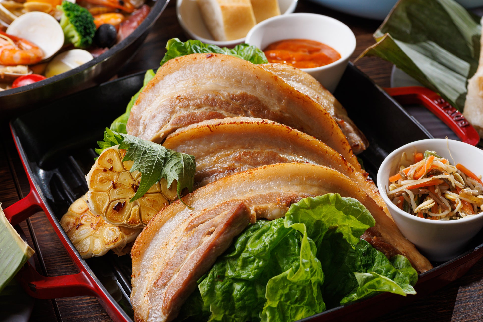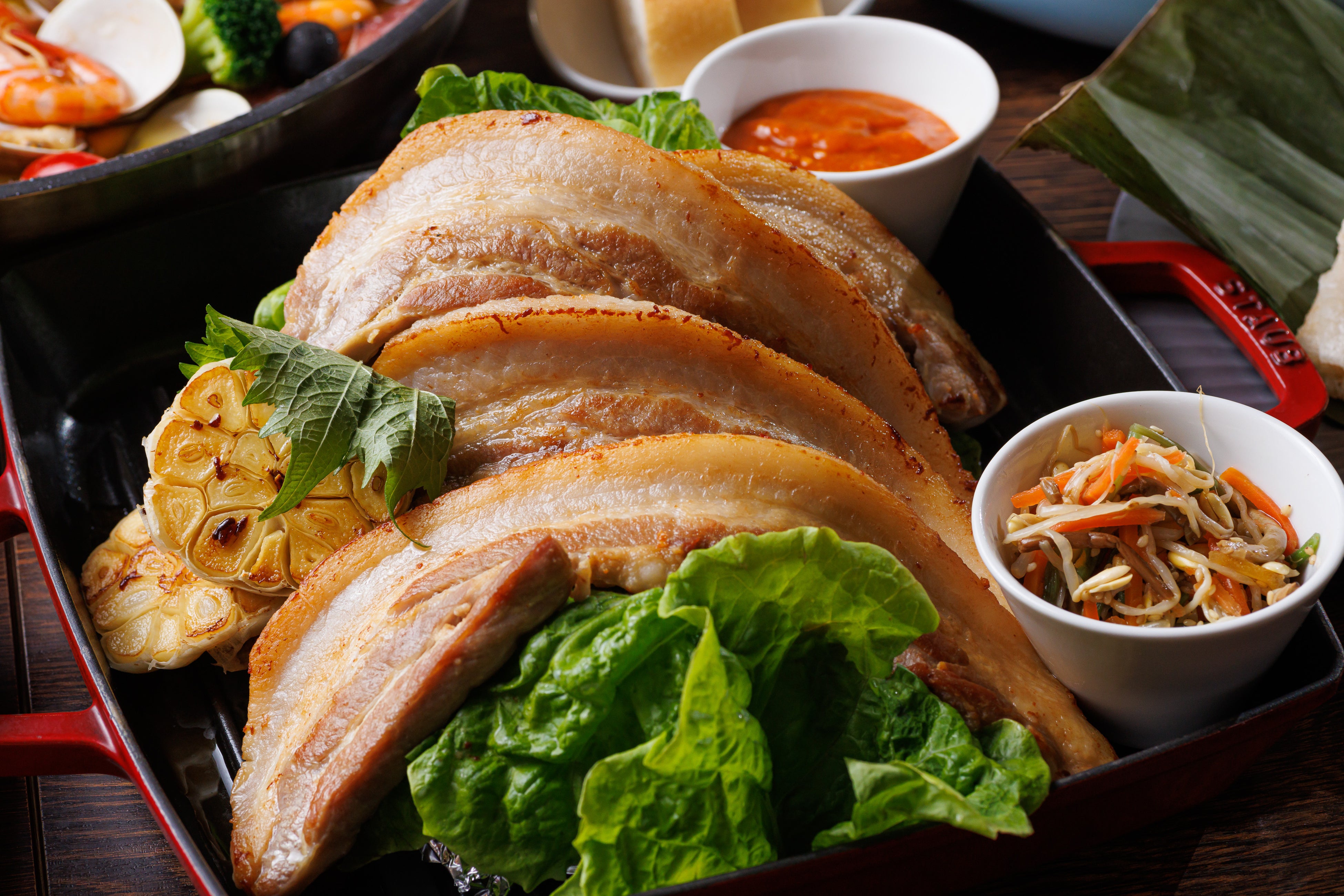 コチュジャンを好きな量お取りいただき、ご自身でサンチュに巻いてお召し上がりください。