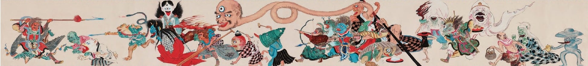 約9.5メートルにわたって、様々な姿をした妖怪たちを描いた絵巻物です。行列の先では神様たちが妖怪を迎え撃つ様子が描かれます。