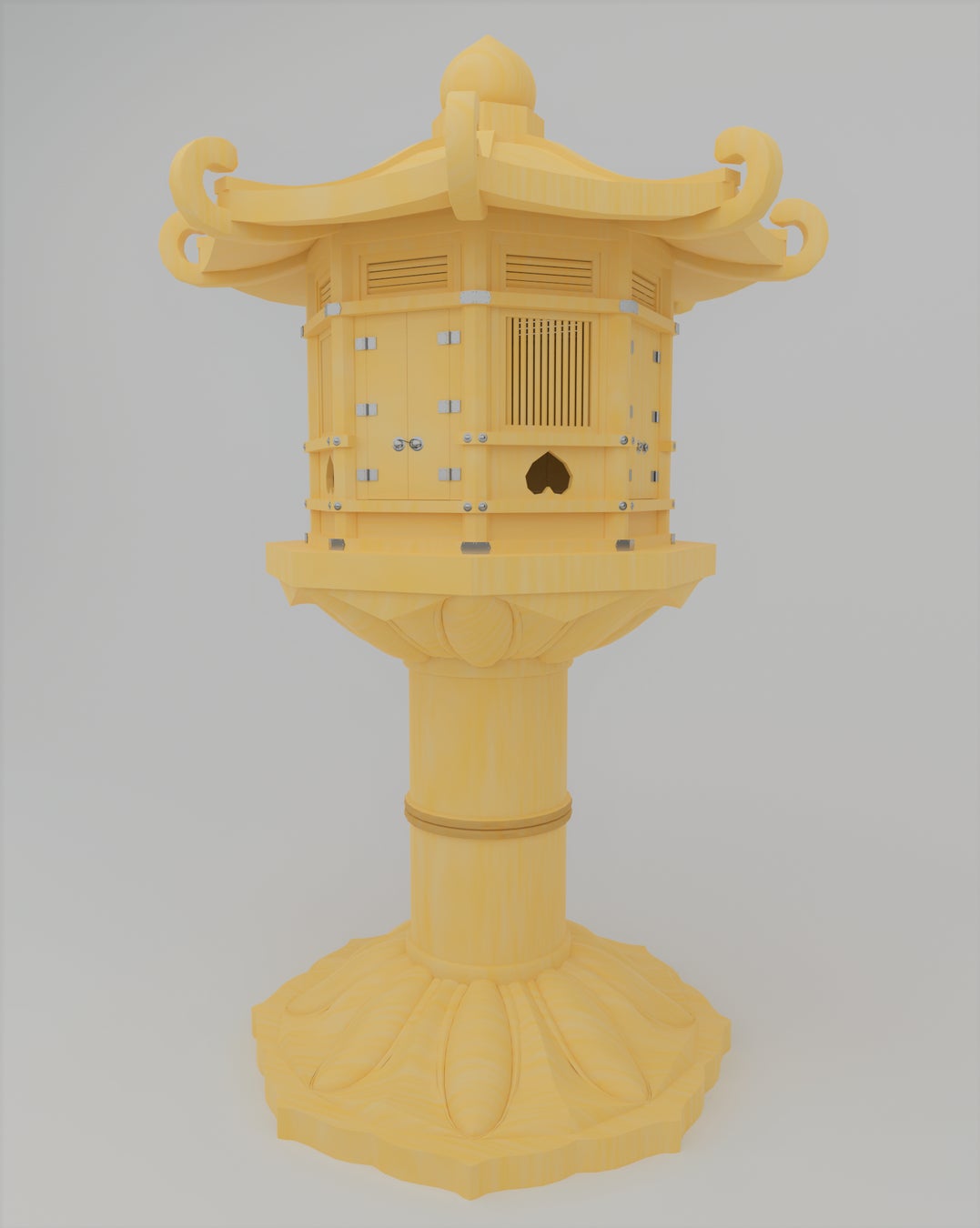 古代の木製燈籠の全体像が分かる事例はありません。現存する石製や銅製の燈籠のほか、古代の建築や工芸品、文献資料などを参考にして、木製燈籠の復元案を全国で初めて作成しました。