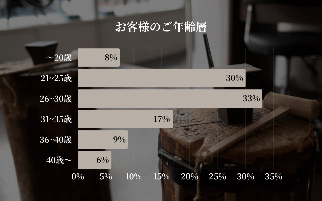 「20代後半(26〜30歳)」が約33%ともっとも多く、次いで「20代前半(21〜25歳)」が約30%と、全体の6割以上を20代が占めています。一方で、11月・12月の年末にかけては30代・40代の割合も上昇する傾向が見られました。これは、クリスマスや記念日といった特別な節目を前に、落ち着いた空間での『モノづくり体験』を求める大人のカップルが増えたためと考えられます。