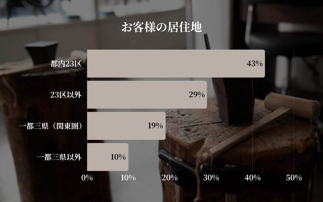 居住地別では、「都内23区内」が約43%と最多で、一都三県を合わせると全体の約90%に達します。代官山という好アクセスな立地から、都内でのデートのメインイベントとして選ばれていることがわかります。また、一都三県以外(地方)からの来客も約10%弱維持しており、旅行の思い出作りとして『icci代官山』を目的に訪れる「目的地型」のニーズも根強く存在しています。