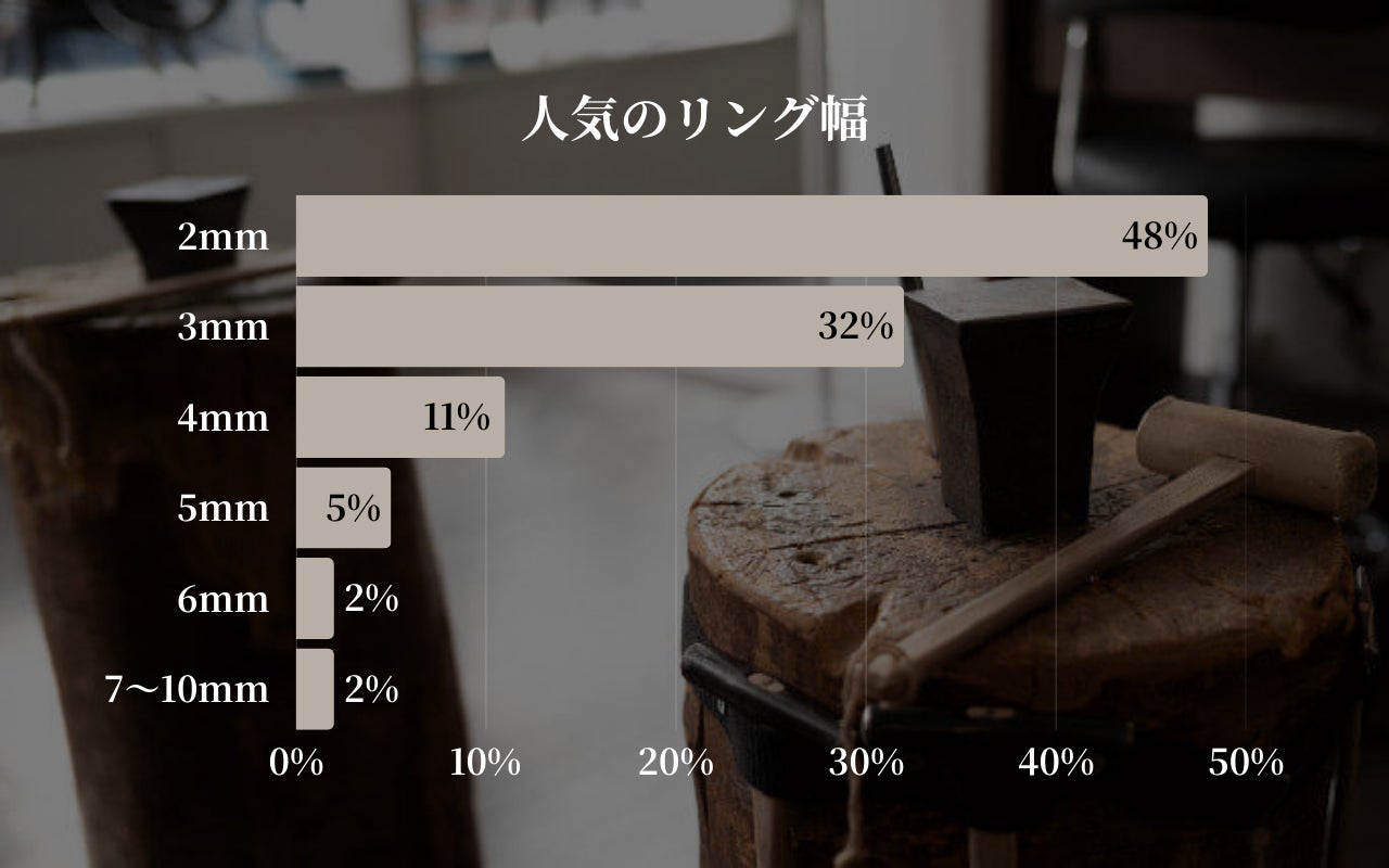 リングの幅は、「2mm(約48%)」と「3mm(32%)」だけで全体の8割を占める結果となりました。昨今のトレンドである『スキンジュエリー』のように肌馴染みの良い細身のスタイルが支持されています。特に2mm幅は女性の指を美しく見せ、男性にとっても普段使いのしやすさからペアで揃えやすく、現代のカップルのライフスタイルにマッチしていると言えます。