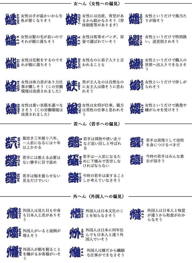 お鮨屋さんによくある魚ネタの漢字湯呑みをハックしたデザイン。女性職人への偏見は「女へん」の漢字、若手職人への偏見は「若へん」、外国人への偏見は「外へん」の漢字を造語にしました。