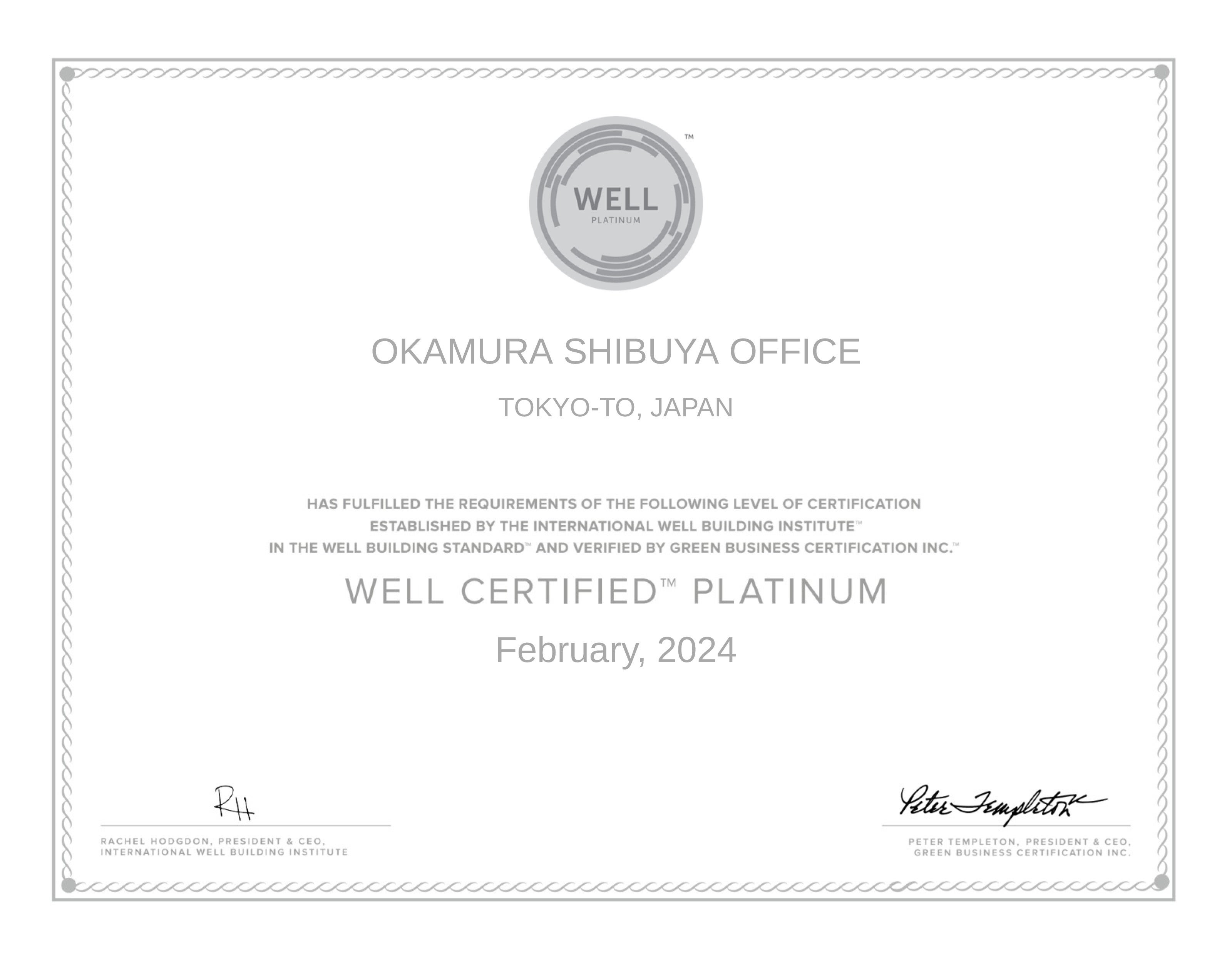 オカムラは、2023年9月に予備認証を取得し、現地調査を経て最高レベルのプラチナを取得しました。