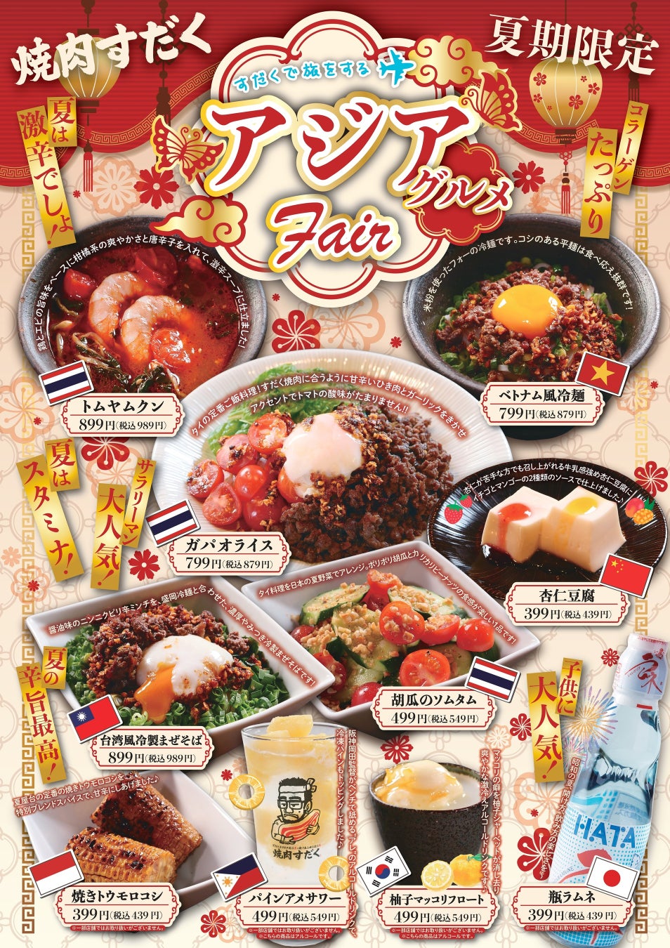 FC加盟店を含む全国の「焼肉すだく」では2024年7月1日(月)より『アジアグルメフェア』がスタートします。
