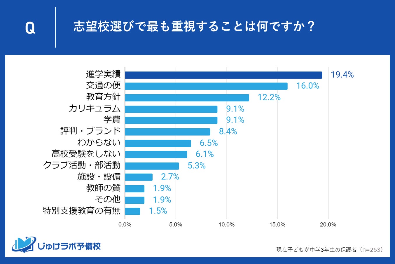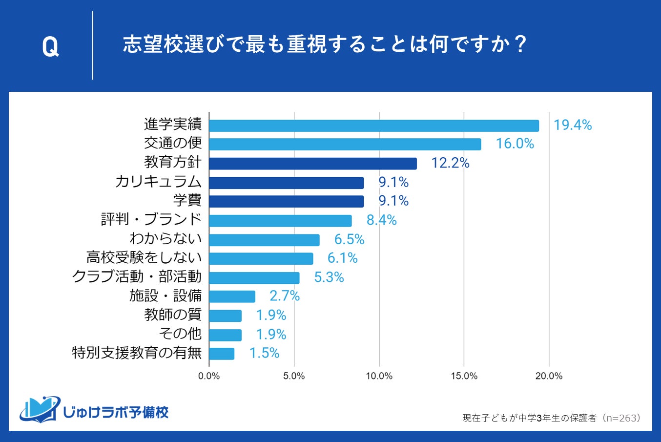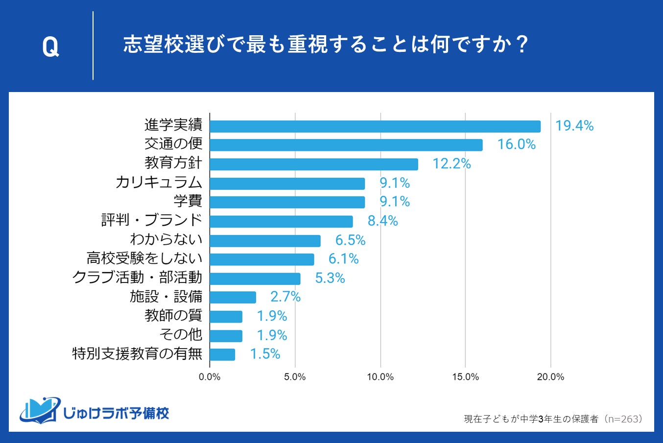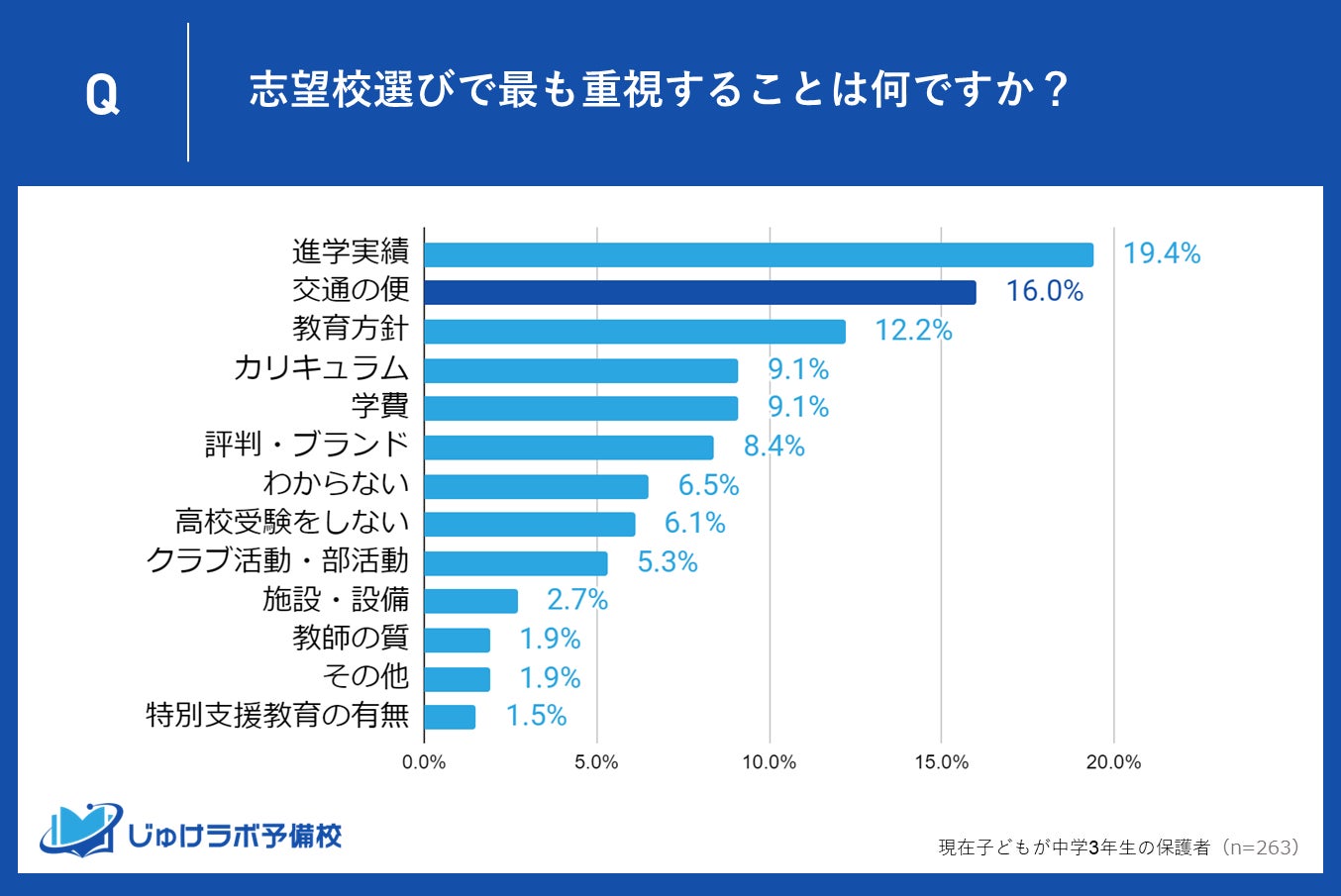今回のアンケート調査の結果、中学3年生の保護者が志望校選びで最も重視するポイントとして「進学実績」と「交通の便」が挙げられました。具体的には、「進学実績」が19.4%、「交通の便」が16.0%と、多くの保護者がこれらの要素を重要視していることがわかります。さらに、保護者たちは「教育方針」(12.2%)や「学費」(9.1%)も重要な選択基準として考えていることが示されました。
