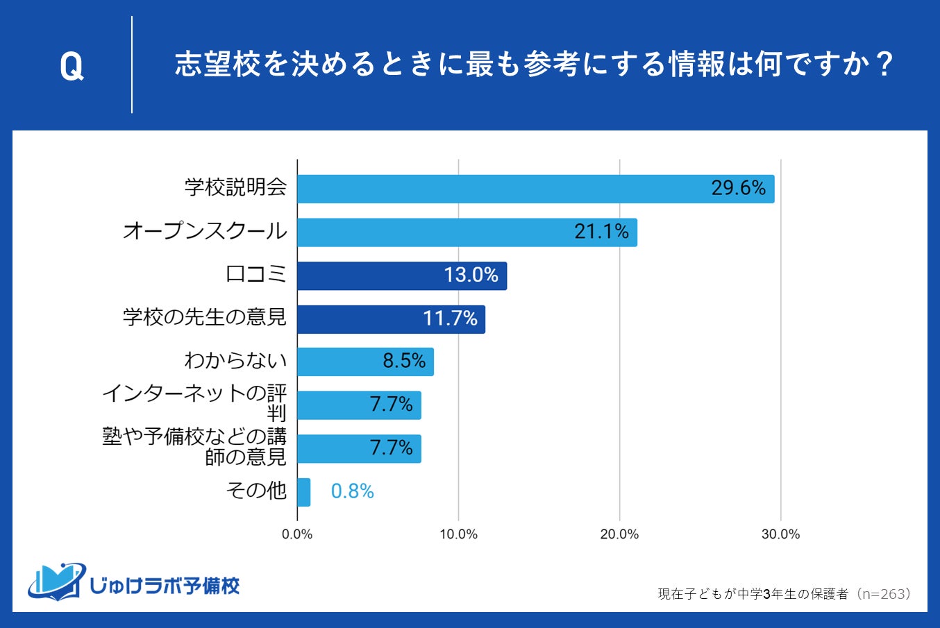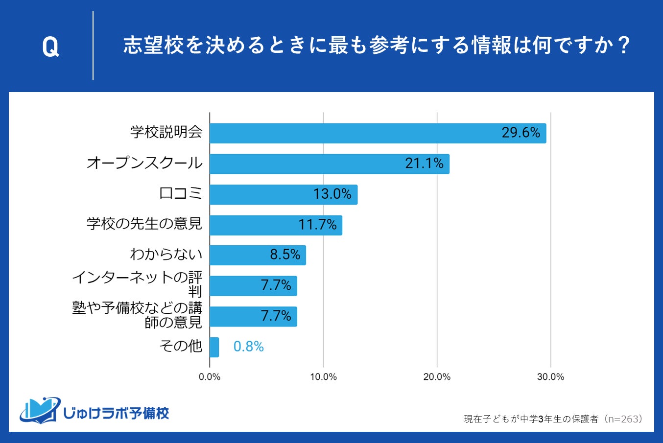 志望校選びにおいて参考にする情報源としては、「学校説明会」(29.6%)が最も多くの支持を集め、「オープンスクール」(21.1%)や「口コミ」(13.0%)も重視されています。保護者たちは、実際に学校を訪れて得られる情報や他の保護者の意見を重要視していることがわかります。