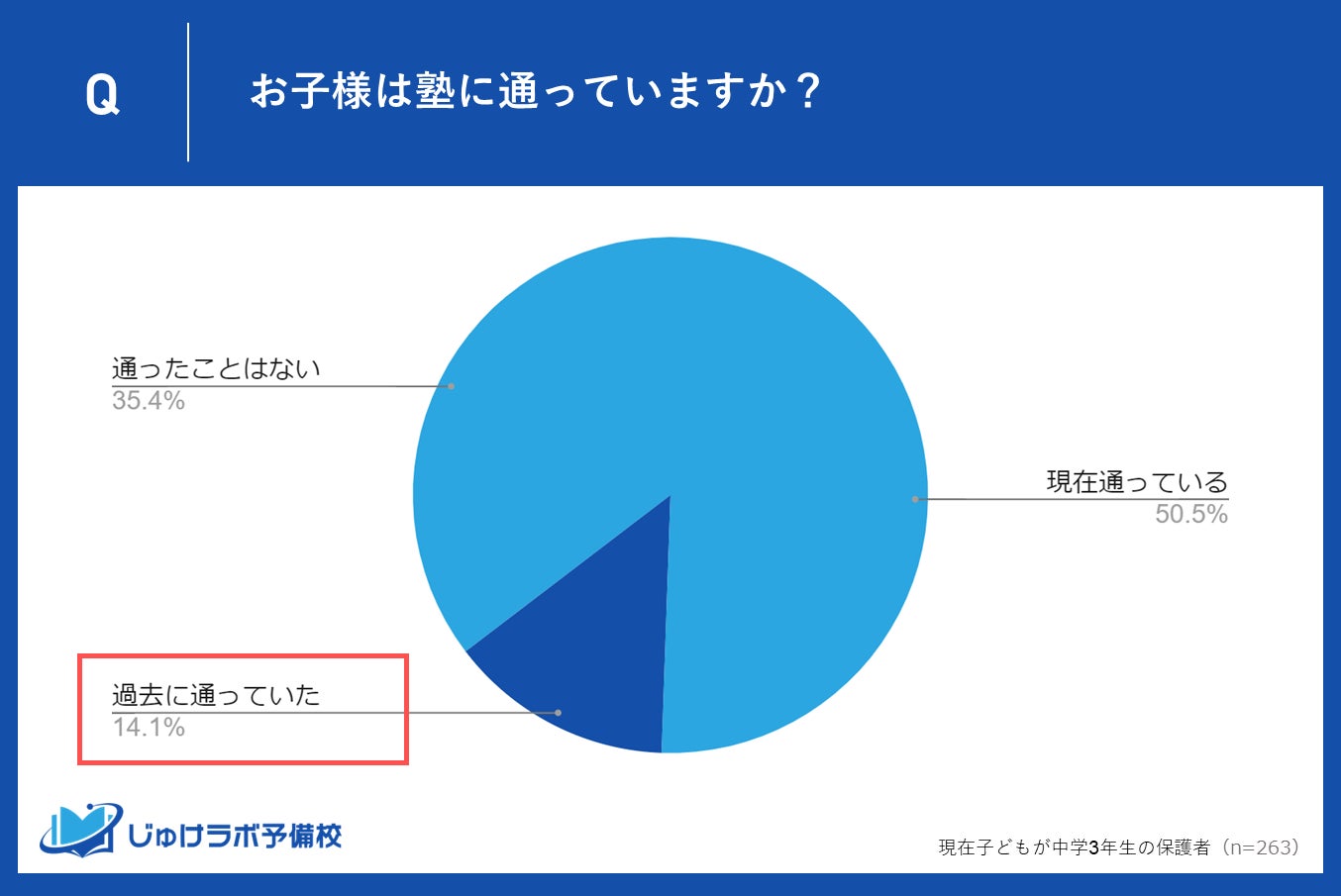 「過去に通っていた」と回答した生徒は14.1%であり、一度は塾のサポートを受けていたことがわかります。これらの生徒は、特定の時期や学年での学習強化や受験対策のために塾を利用していたと考えられます