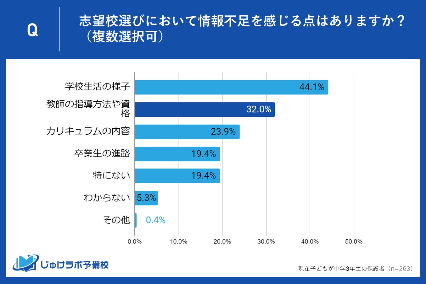 情報不足を感じる点については、「学校生活の様子」(44.1%)や「教師の指導方法や資格」(32.0%)が特に多くの保護者から挙げられました。子供がどのような学校生活を送るのか、また教師の質についての具体的な情報を求めていることが明らかになりました。