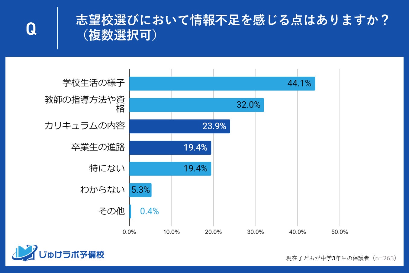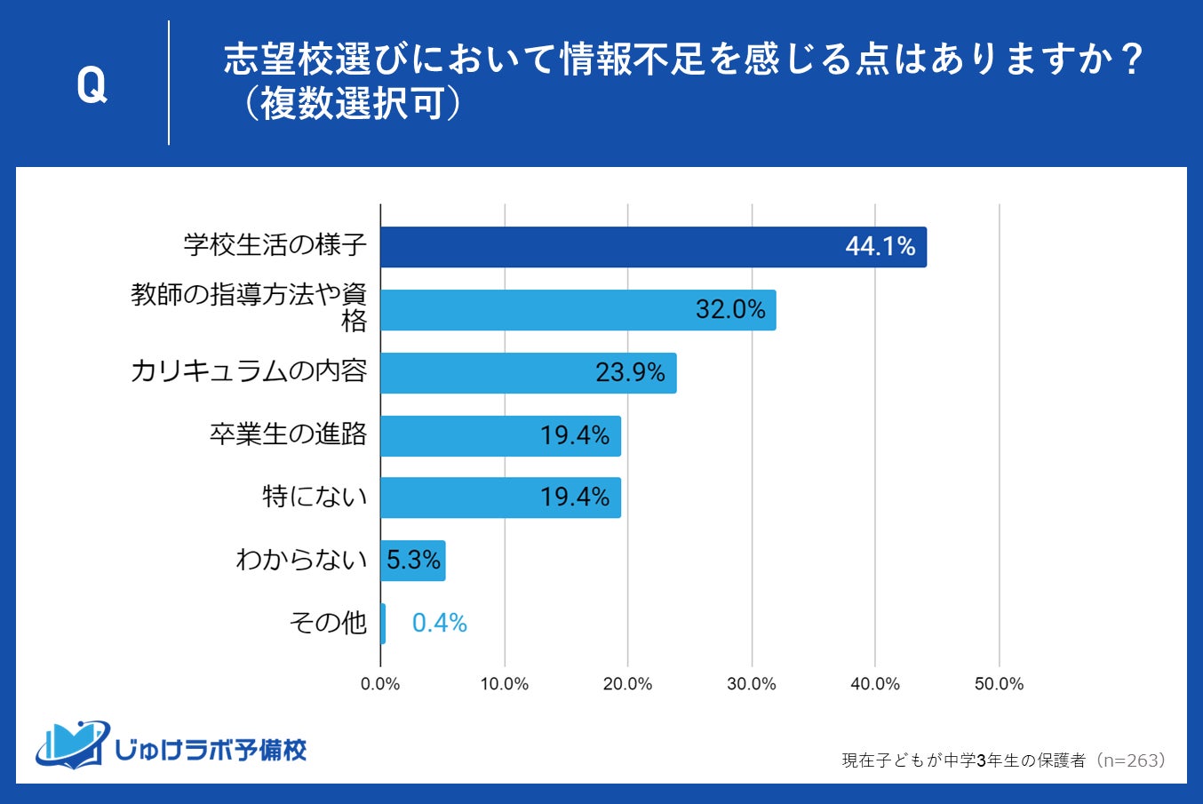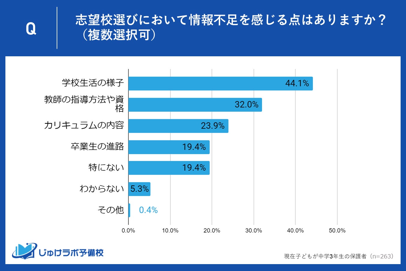 中学3年生の保護者を対象に行ったアンケート調査の結果、志望校選びにおいて最も情報不足を感じる点として「学校生活の様子」が44.1%と最も多くの回答を集めました。