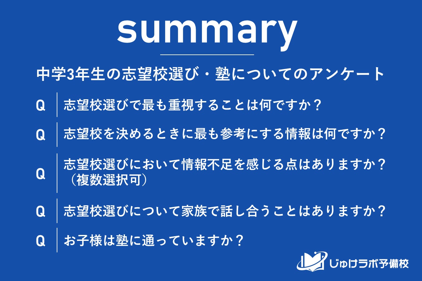 じゅけラボ予備校(所在地:大阪市北区、代表取締役:後藤智則)は、現在、中学生3年生の保護者263名を対象に、志望高校選びに関する意識調査を実施しました。