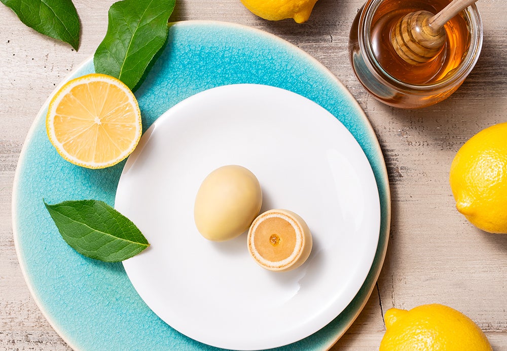 レモン果皮を加えることで、よりフレッシュな風味と食感のアクセントをプラスしたレモネード餡で、優しい甘さのはちみつペーストを包み、カステラ生地とふんわりとレモン香る淡い黄色のチョコでコーティング。甘くて爽やかなレモネードの味わいをつつみこんだ、かわいいたまご型のお菓子を作りました。冷やしてもおいしくお召し上がりいただけます。