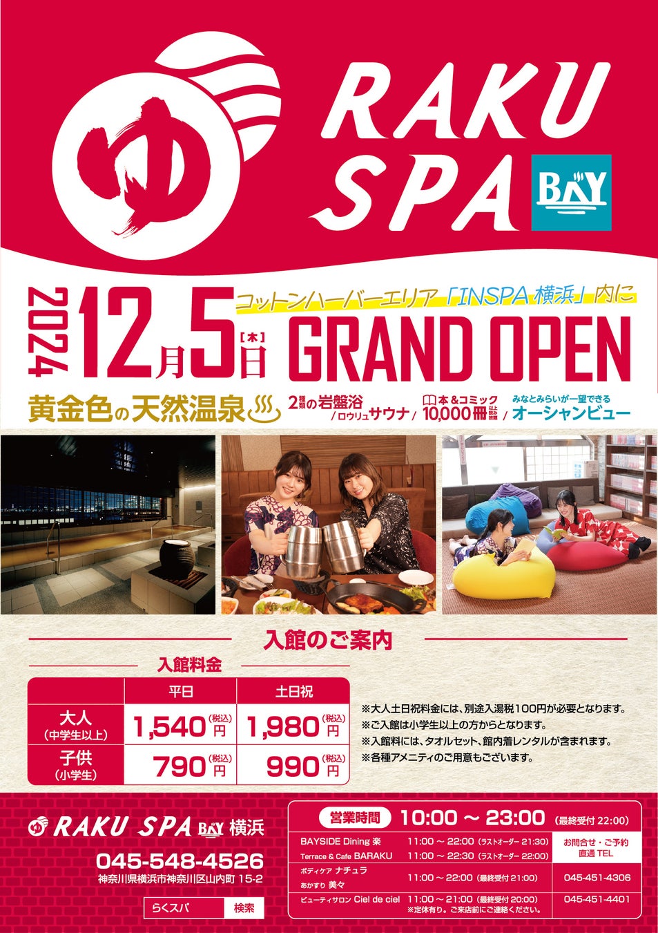 株式会社極楽湯(本社:東京都千代田区、代表取締役社長:佐藤 剛史)は、神奈川県横浜市の「INSPA横浜」内において、12月5日(木)に「RAKU SPA BAY 横浜」を新規開業しますので、お知らせいたします。